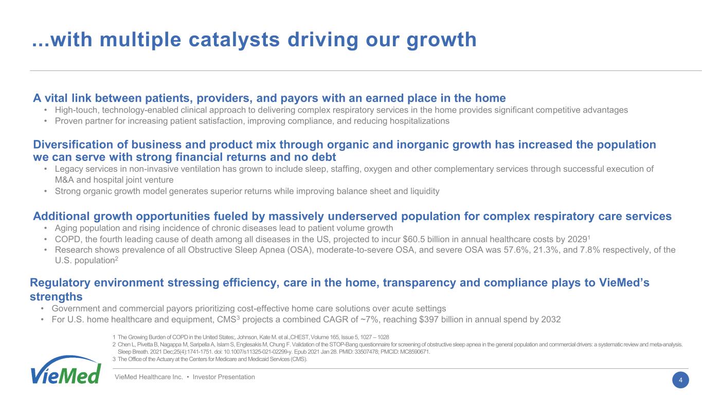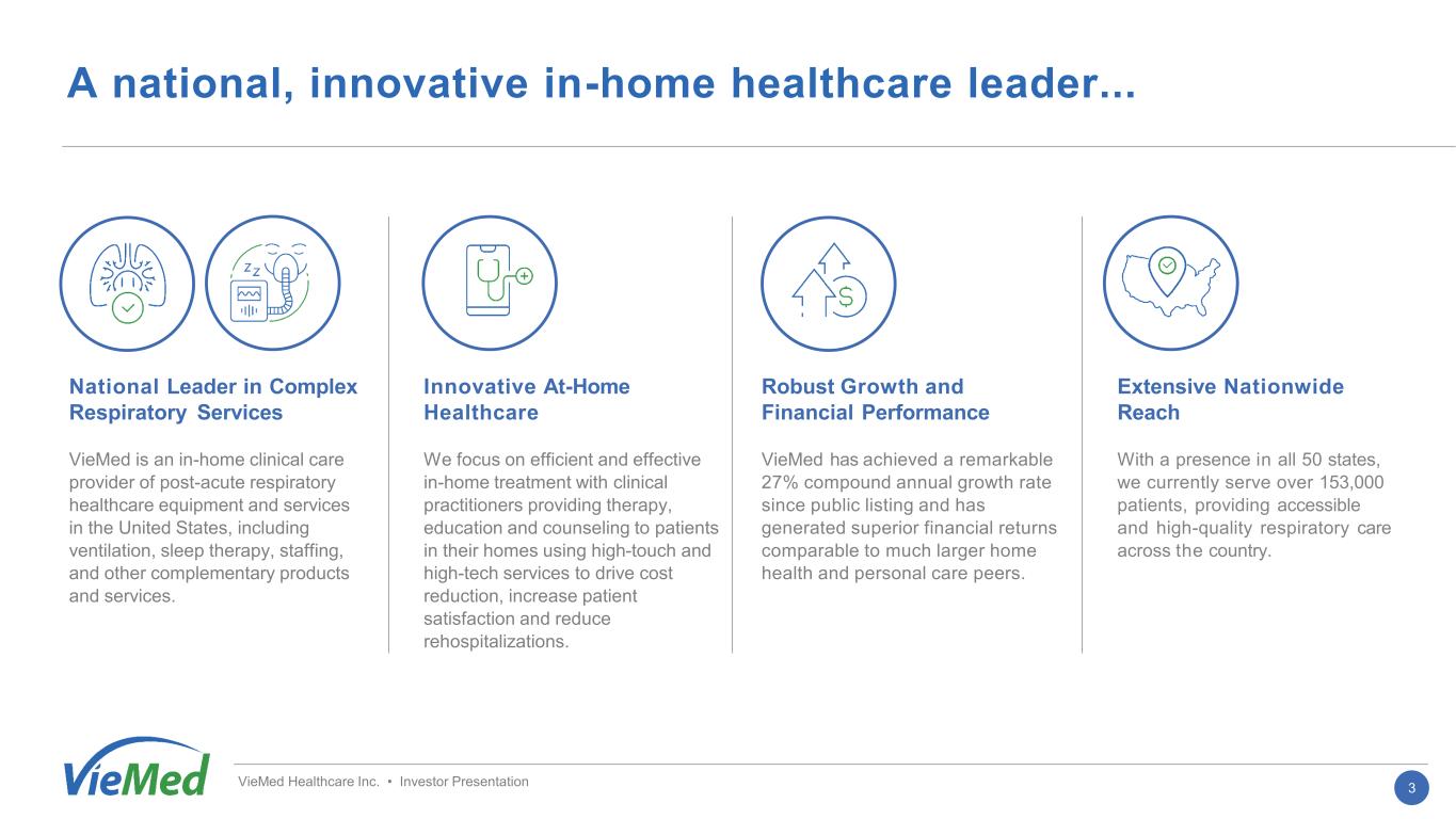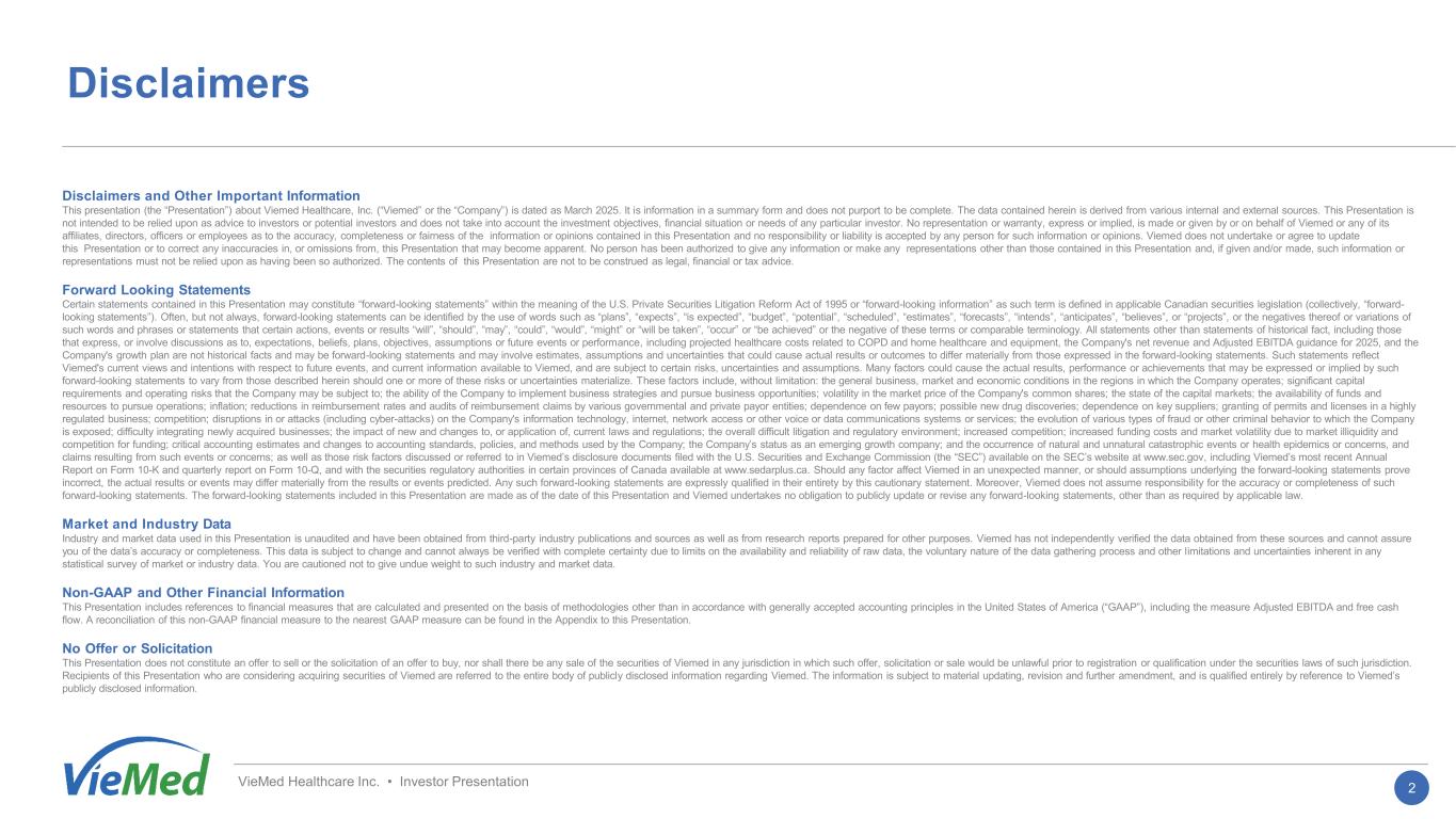Disclaimers VieMed Healthcare Inc. • Investor Presentation Disclaimers and Other Important Information This presentation (the “Presentation”) about Viemed Healthcare, Inc. (“Viemed” or the “Company”) is dated as March 2025. It is information in a summary form and does not purport to be complete. The data contained herein is derived from various internal and external sources. This Presentation is not intended to be relied upon as advice to investors or potential investors and does not take into account the investment objectives, financial situation or needs of any particular investor. No representation or warranty, express or implied, is made or given by or on behalf of Viemed or any of its affiliates, directors, officers or employees as to the accuracy, completeness or fairness of the information or opinions contained in this Presentation and no responsibility or liability is accepted by any person for such information or opinions. Viemed does not undertake or agree to update this Presentation or to correct any inaccuracies in, or omissions from, this Presentation that may become apparent. No person has been authorized to give any information or make any representations other than those contained in this Presentation and, if given and/or made, such information or representations must not be relied upon as having been so authorized. The contents of this Presentation are not to be construed as legal, financial or tax advice. Forward Looking Statements Certain statements contained in this Presentation may constitute “forward-looking statements” within the meaning of the U.S. Private Securities Litigation Reform Act of 1995 or “forward-looking information” as such term is defined in applicable Canadian securities legislation (collectively, “forward- looking statements”). Often, but not always, forward-looking statements can be identified by the use of words such as “plans”, “expects”, “is expected”, “budget”, “potential”, “scheduled”, “estimates”, “forecasts”, “intends”, “anticipates”, “believes”, or “projects”, or the negatives thereof or variations of such words and phrases or statements that certain actions, events or results “will”, “should”, “may”, “could”, “would”, “might” or “will be taken”, “occur” or “be achieved” or the negative of these terms or comparable terminology. All statements other than statements of historical fact, including those that express, or involve discussions as to, expectations, beliefs, plans, objectives, assumptions or future events or performance, including projected healthcare costs related to COPD and home healthcare and equipment, the Company's net revenue and Adjusted EBITDA guidance for 2025, and the Company's growth plan are not historical facts and may be forward-looking statements and may involve estimates, assumptions and uncertainties that could cause actual results or outcomes to differ materially from those expressed in the forward-looking statements. Such statements reflect Viemed's current views and intentions with respect to future events, and current information available to Viemed, and are subject to certain risks, uncertainties and assumptions. Many factors could cause the actual results, performance or achievements that may be expressed or implied by such forward-looking statements to vary from those described herein should one or more of these risks or uncertainties materialize. These factors include, without limitation: the general business, market and economic conditions in the regions in which the Company operates; significant capital requirements and operating risks that the Company may be subject to; the ability of the Company to implement business strategies and pursue business opportunities; volatility in the market price of the Company's common shares; the state of the capital markets; the availability of funds and resources to pursue operations; inflation; reductions in reimbursement rates and audits of reimbursement claims by various governmental and private payor entities; dependence on few payors; possible new drug discoveries; dependence on key suppliers; granting of permits and licenses in a highly regulated business; competition; disruptions in or attacks (including cyber-attacks) on the Company's information technology, internet, network access or other voice or data communications systems or services; the evolution of various types of fraud or other criminal behavior to which the Company is exposed; difficulty integrating newly acquired businesses; the impact of new and changes to, or application of, current laws and regulations; the overall difficult litigation and regulatory environment; increased competition; increased funding costs and market volatility due to market illiquidity and competition for funding; critical accounting estimates and changes to accounting standards, policies, and methods used by the Company; the Company’s status as an emerging growth company; and the occurrence of natural and unnatural catastrophic events or health epidemics or concerns, and claims resulting from such events or concerns; as well as those risk factors discussed or referred to in Viemed’s disclosure documents filed with the U.S. Securities and Exchange Commission (the “SEC”) available on the SEC’s website at www.sec.gov, including Viemed’s most recent Annual Report on Form 10-K and quarterly report on Form 10-Q, and with the securities regulatory authorities in certain provinces of Canada available at www.sedarplus.ca. Should any factor affect Viemed in an unexpected manner, or should assumptions underlying the forward-looking statements prove incorrect, the actual results or events may differ materially from the results or events predicted. Any such forward-looking statements are expressly qualified in their entirety by this cautionary statement. Moreover, Viemed does not assume responsibility for the accuracy