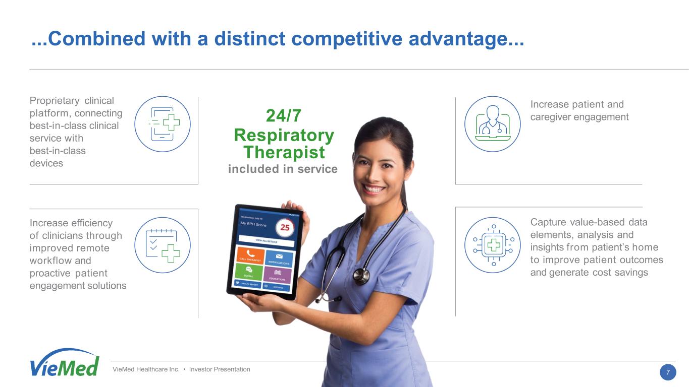 ...And backed by real-world results... VieMed Healthcare Inc. • Investor Presentation Non-invasive ventilation at home reduces mortality in COPD with CRF September 15, 2021 December 29, 2020June 29, 2022 Sample size: 500,000 patients Sample size: 36,000 patients Sample size: 45,000 patients 43% Relative mortality reduction if utilized within 0-7 days 11.6% Cost reduction if utilized within 0-7 days 7.2% Cost reduction if utilized within0-15 days $5,484 Cost reduction if utilized within 0-7 days Early initiation of non-invasive ventilation at home reduces mortality, hospitalizations, and overall health costs Non-invasive ventilation at home reduces mortality in COPD with CRF 31% Relative reduction in hospital readmissions 38% Immediate reduction in risk of death with NIV 12% Relative reduction in mortality after 12 months 16% Relative reduction in ER visits Non-invasive ventilation at home improves survival and decreases healthcare utilization 39% Relative reduction in all-cause mortality over 7-year period 9% Relative decline in the risk of hospitalizations 22% Relative reduction in the risk of an ER visit 8