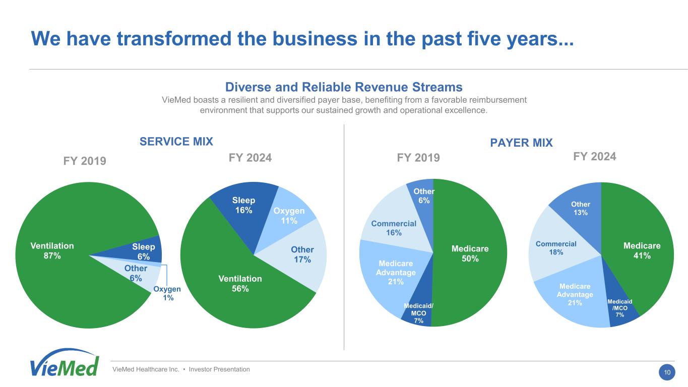Ventilation 87% Sleep 6% Oxygen 1% Other 6% Medicare 41% Medicaid /MCO 7% Medicare Advantage 21% Commercial 18% Other 13% Medicare 50% Medicaid/ MCO 7% Medicare Advantage 21% Commercial 16% Other 6% Ventilation 56% Sleep 16% Oxygen 11% Other 17% We have transformed the business in the past five years... SERVICE MIX PAYER MIX VieMed Healthcare Inc. • Investor Presentation Diverse and Reliable Revenue Streams VieMed boasts a resilient and diversified payer base, benefiting from a favorable reimbursement environment that supports our sustained growth and operational excellence. FY 2024FY 2019 FY 2019 FY 2024 10