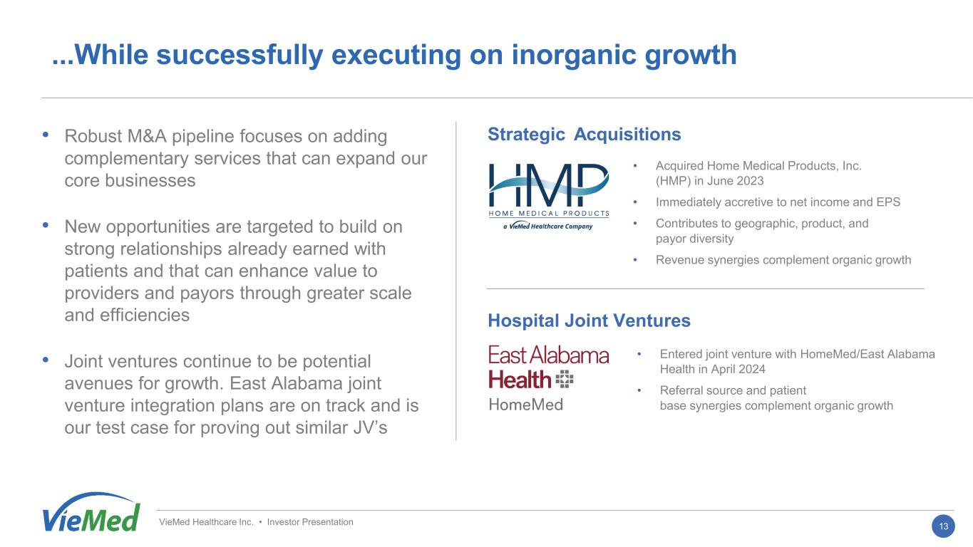 VieMed Healthcare Inc. • Investor Presentation • Robust M&A pipeline focuses on adding complementary services that can expand our core businesses • New opportunities are targeted to build on strong relationships already earned with patients and that can enhance value to providers and payors through greater scale and efficiencies • Joint ventures continue to be potential avenues for growth. East Alabama joint venture integration plans are on track and is our test case for proving out similar JV’s • Acquired Home Medical Products, Inc. (HMP) in June 2023 • Immediately accretive to net income and EPS • Contributes to geographic, product, and payor diversity • Revenue synergies complement organic growth Strategic Acquisitions Hospital Joint Ventures • Entered joint venture with HomeMed/East Alabama Health in April 2024 • Referral source and patient base synergies complement organic growth 13 ...While successfully executing on inorganic growth
