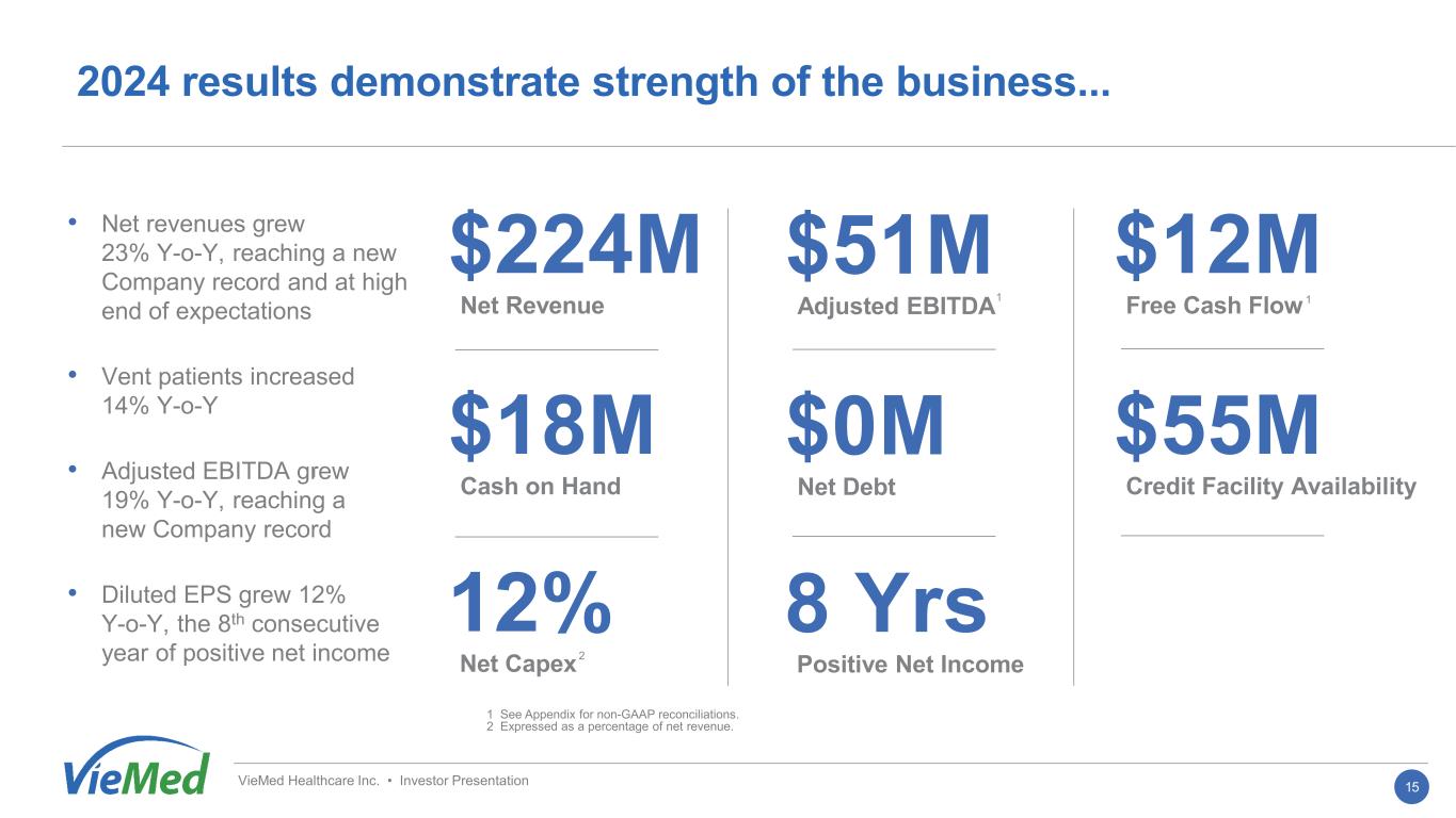 • Net revenues grew 23% Y-o-Y, reaching a new Company record and at high end of expectations • Vent patients increased 14% Y-o-Y • Adjusted EBITDA grew 19% Y-o-Y, reaching a new Company record • Diluted EPS grew 12% Y-o-Y, the 8th consecutive year of positive net income VieMed Healthcare Inc. • Investor Presentation $224M Net Revenue $51M Adjusted EBITDA $12M Free Cash Flow $18M Cash on Hand $0M Net Debt $55M Credit Facility Availability 12% Net Capex 8 Yrs Positive Net Income 1 See Appendix for non-GAAP reconciliations. 2 Expressed as a percentage of net revenue. 1 1 1 15 2024 results demonstrate strength of the business... 2