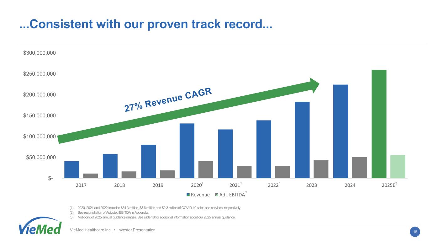 VieMed Healthcare Inc. • Investor Presentation $- $50,000,000 $100,000,000 $150,000,000 $200,000,000 $250,000,000 $300,000,000 2017 2018 2019 2020 2021 2022 2023 2024 2025E Revenue Adj. EBITDA (1) 2020, 2021 and 2022 Includes $34.3 million, $8.6 million and $2.3 million of COVID-19 sales and services, respectively. (2) See reconciliation of Adjusted EBITDA in Appendix. (3) Mid-point of 2025 annual guidance ranges. See slide 18 for additional information about our 2025 annual guidance. 1 1 1 3 2 16 ...Consistent with our proven track record...