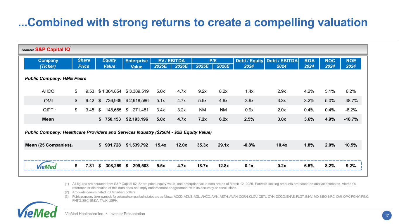 Company Share Equity Enterprise Debt / Equity Debt / EBITDA ROA ROC ROE (Ticker) Price Value Value 2025E 2026E 2025E 2026E 2024 2024 2024 2024 2024 Public Company: HME Peers AHCO $ 9.53 $ 1,364,854 $ 3,389,519 5.0x 4.7x 9.2x 8.2x 1.4x 2.9x 4.2% 5.1% 6.2% OMI $ 9.42 $ 736,939 $ 2,918,586 5.1x 4.7x 5.5x 4.6x 3.9x 3.3x 3.2% 5.0% -48.7% QIPT $ 3.45 $ 148,665 $ 271,481 3.4x 3.2x NM NM 0.9x 2.0x 0.4% 0.4% -6.2% Mean 750,153$ 2,193,196$ 5.0x 4.7x 7.2x 6.2x 2.5% 3.0x 3.6% 4.9% -18.7% Public Company: Healthcare Providers and Services Industry ($250M - $2B Equity Value) Mean (25 Companies) 901,728$ 1,539,792$ 15.4x 12.0x 35.3x 29.1x -0.8% 10.4x 1.8% 2.0% 10.5% $ 7.81 $ 308,269 $ 299,503 5.5x 4.7x 18.7x 12.8x 0.1x 0.2x 6.5% 8.2% 9.2% EV / EBITDA P/E (1) All figures are sourced from S&P Capital IQ. Share price, equity value, and enterprise value data are as of March 12, 2025. Forward-looking amounts are based on analyst estimates. Viemed’s reference or distribution of this data does not imply endorsement or agreement with its accuracy or conclusions. (2) Amounts denominated in Canadian dollars. (3) Public company ticker symbols for selected companies included are as follows: ACCD, ADUS, AGL, AHCO, AMN, ASTH, AVAH, CCRN, CLOV, CSTL, CYH, DCGO, EHAB, FLGT, INNV, MD, NEO, NRC, OMI, OPK, PGNY, PINC, PNTG, SBC, SNDA, TALK, USPH. VieMed Healthcare Inc. • Investor Presentation 17 1 3 Source: S&P Capital IQ 1 2 ...Combined with strong returns to create a compelling valuation