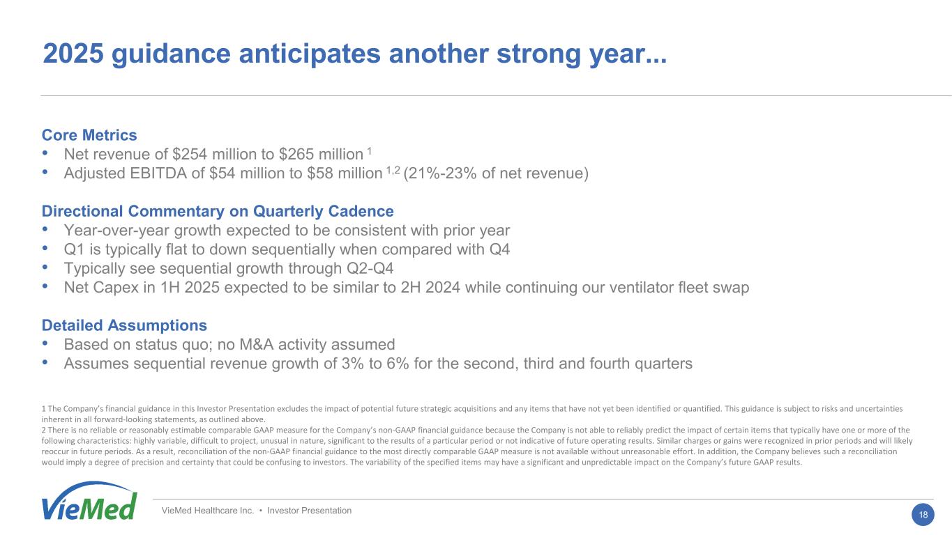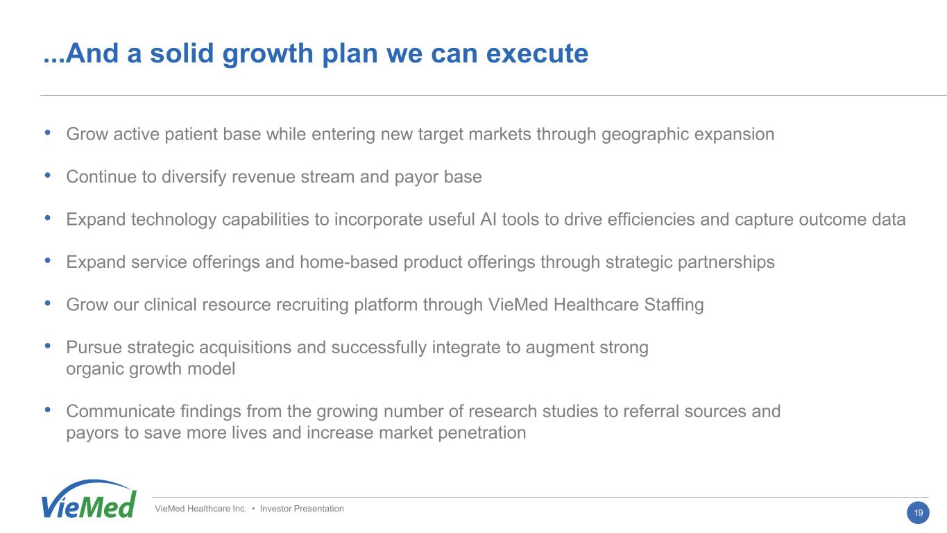 Core Metrics • Net revenue of $254 million to $265 million 1 • Adjusted EBITDA of $54 million to $58 million 1,2 (21%-23% of net revenue) Directional Commentary on Quarterly Cadence • Year-over-year growth expected to be consistent with prior year • Q1 is typically flat to down sequentially when compared with Q4 • Typically see sequential growth through Q2-Q4 • Net Capex in 1H 2025 expected to be similar to 2H 2024 while continuing our ventilator fleet swap Detailed Assumptions • Based on status quo; no M&A activity assumed • Assumes sequential revenue growth of 3% to 6% for the second, third and fourth quarters VieMed Healthcare Inc. • Investor Presentation 1 The Company’s financial guidance in this Investor Presentation excludes the impact of potential future strategic acquisitions and any items that have not yet been identified or quantified. This guidance is subject to risks and uncertainties inherent in all forward-looking statements, as outlined above. 2 There is no reliable or reasonably estimable comparable GAAP measure for the Company’s non-GAAP financial guidance because the Company is not able to reliably predict the impact of certain items that typically have one or more of the following characteristics: highly variable, difficult to project, unusual in nature, significant to the results of a particular period or not indicative of future operating results. Similar charges or gains were recognized in prior periods and will likely reoccur in future periods. As a result, reconciliation of the non-GAAP financial guidance to the most directly comparable GAAP measure is not available without unreasonable effort. In addition, the Company believes such a reconciliation would imply a degree of precision and certainty that could be confusing to investors. The variability of the specified items may have a significant and unpredictable impact on the Company’s future GAAP results. 18 2025 guidance anticipates another strong year...