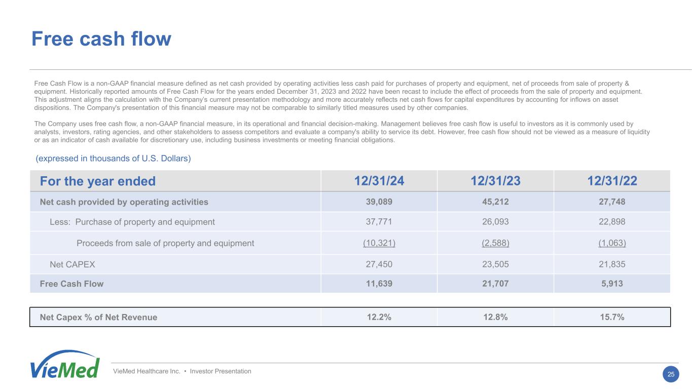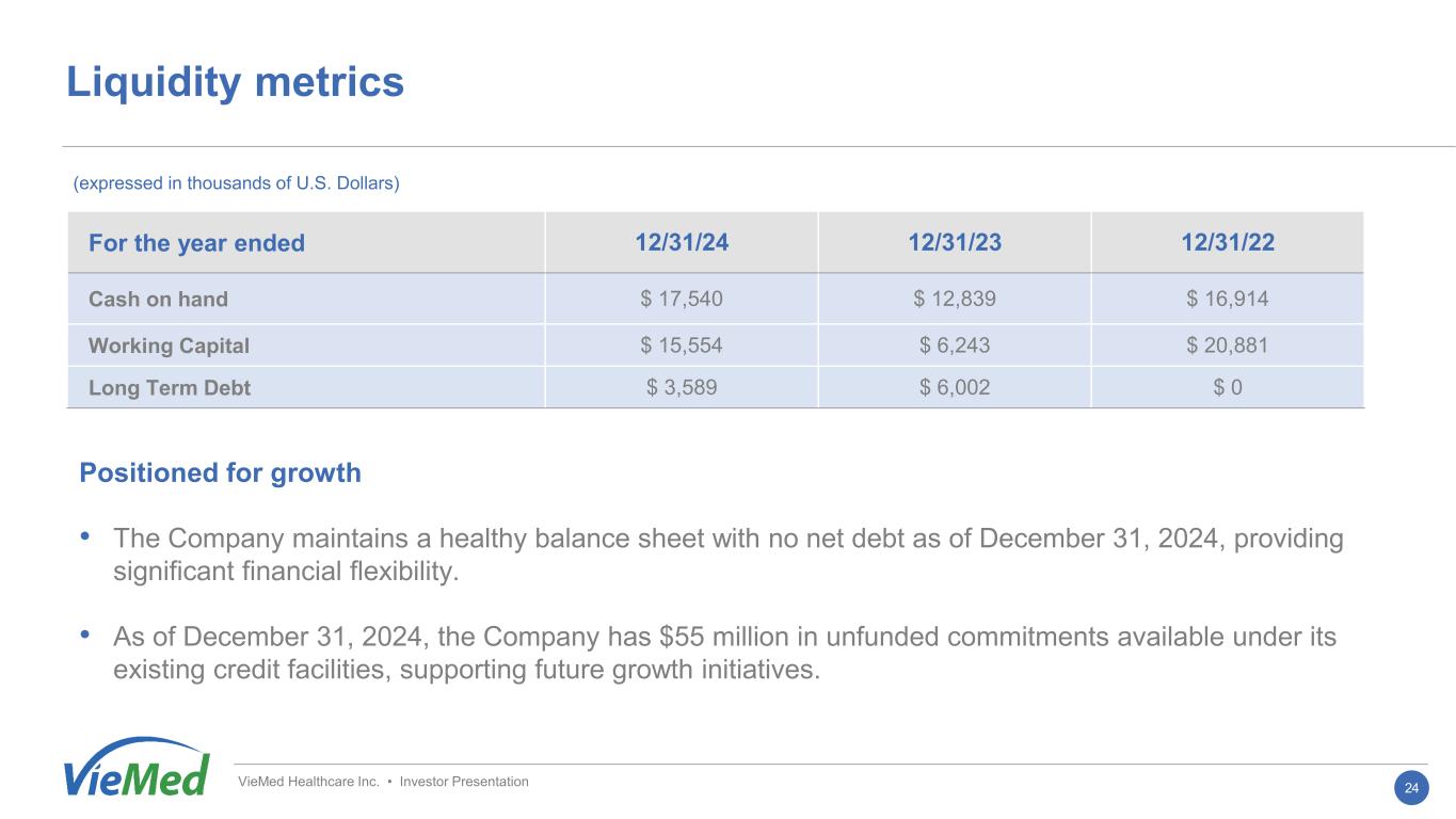 Liquidity metrics Positioned for growth • The Company maintains a healthy balance sheet with no net debt as of December 31, 2024, providing significant financial flexibility. • As of December 31, 2024, the Company has $55 million in unfunded commitments available under its existing credit facilities, supporting future growth initiatives. For the year ended 12/31/24 12/31/23 12/31/22 Cash on hand $ 17,540 $ 12,839 $ 16,914 Working Capital $ 15,554 $ 6,243 $ 20,881 Long Term Debt $ 3,589 $ 6,002 $ 0 VieMed Healthcare Inc. • Investor Presentation (expressed in thousands of U.S. Dollars) 24