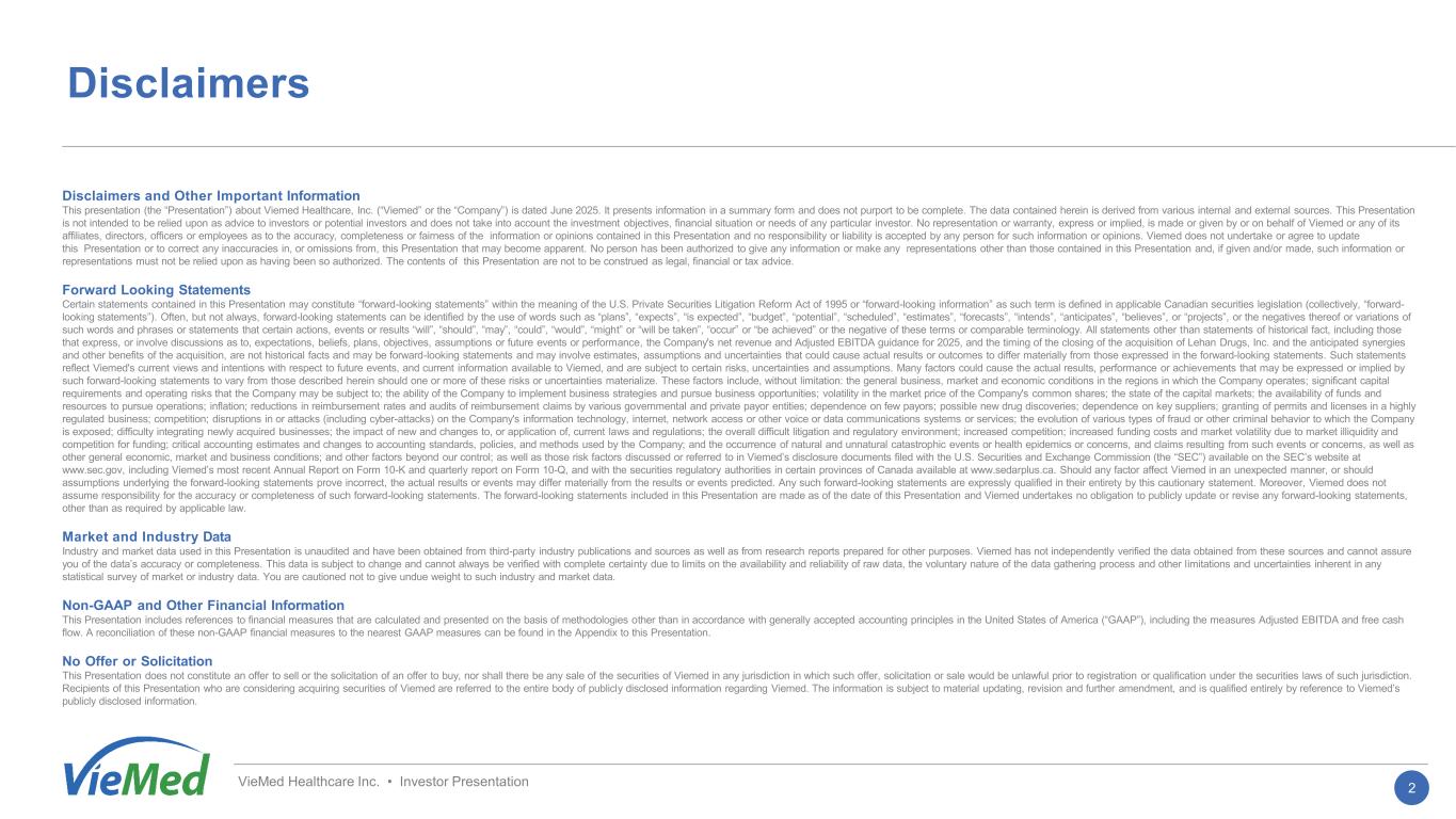Disclaimers VieMed Healthcare Inc. • Investor Presentation Disclaimers and Other Important Information This presentation (the “Presentation”) about Viemed Healthcare, Inc. (“Viemed” or the “Company”) is dated June 2025. It presents information in a summary form and does not purport to be complete. The data contained herein is derived from various internal and external sources. This Presentation is not intended to be relied upon as advice to investors or potential investors and does not take into account the investment objectives, financial situation or needs of any particular investor. No representation or warranty, express or implied, is made or given by or on behalf of Viemed or any of its affiliates, directors, officers or employees as to the accuracy, completeness or fairness of the information or opinions contained in this Presentation and no responsibility or liability is accepted by any person for such information or opinions. Viemed does not undertake or agree to update this Presentation or to correct any inaccuracies in, or omissions from, this Presentation that may become apparent. No person has been authorized to give any information or make any representations other than those contained in this Presentation and, if given and/or made, such information or representations must not be relied upon as having been so authorized. The contents of this Presentation are not to be construed as legal, financial or tax advice. Forward Looking Statements Certain statements contained in this Presentation may constitute “forward-looking statements” within the meaning of the U.S. Private Securities Litigation Reform Act of 1995 or “forward-looking information” as such term is defined in applicable Canadian securities legislation (collectively, “forward- looking statements”). Often, but not always, forward-looking statements can be identified by the use of words such as “plans”, “expects”, “is expected”, “budget”, “potential”, “scheduled”, “estimates”, “forecasts”, “intends”, “anticipates”, “believes”, or “projects”, or the negatives thereof or variations of such words and phrases or statements that certain actions, events or results “will”, “should”, “may”, “could”, “would”, “might” or “will be taken”, “occur” or “be achieved” or the negative of these terms or comparable terminology. All statements other than statements of historical fact, including those that express, or involve discussions as to, expectations, beliefs, plans, objectives, assumptions or future events or performance, the Company's net revenue and Adjusted EBITDA guidance for 2025, and the timing of the closing of the acquisition of Lehan Drugs, Inc. and the anticipated synergies and other benefits of the acquisition, are not historical facts and may be forward-looking statements and may involve estimates, assumptions and uncertainties that could cause actual results or outcomes to differ materially from those expressed in the forward-looking statements. Such statements reflect Viemed's current views and intentions with respect to future events, and current information available to Viemed, and are subject to certain risks, uncertainties and assumptions. Many factors could cause the actual results, performance or achievements that may be expressed or implied by such forward-looking statements to vary from those described herein should one or more of these risks or uncertainties materialize. These factors include, without limitation: the general business, market and economic conditions in the regions in which the Company operates; significant capital requirements and operating risks that the Company may be subject to; the ability of the Company to implement business strategies and pursue business opportunities; volatility in the market price of the Company's common shares; the state of the capital markets; the availability of funds and resources to pursue operations; inflation; reductions in reimbursement rates and audits of reimbursement claims by various governmental and private payor entities; dependence on few payors; possible new drug discoveries; dependence on key suppliers; granting of permits and licenses in a highly regulated business; competition; disruptions in or attacks (including cyber-attacks) on the Company's information technology, internet, network access or other voice or data communications systems or services; the evolution of various types of fraud or other criminal behavior to which the Company is exposed; difficulty integrating newly acquired businesses; the impact of new and changes to, or application of, current laws and regulations; the overall difficult litigation and regulatory environment; increased competition; increased funding costs and market volatility due to market illiquidity and competition for funding; critical accounting estimates and changes to accounting standards, policies, and methods used by the Company; and the occurrence of natural and unnatural catastrophic events or health epidemics or concerns, and claims resulting from such events or concerns, as well as other general economic, market and business conditions; and other factors beyond our control; as well as those risk factors discussed or referred to in Viemed’s disclosure documents filed with the U.S. Securities and Exchange Commission (the “SEC”) available on the SEC’s website at www.sec.gov, including Viemed’s most recent Annual Report on Form 10-K and quarterly report on Form 10-Q, and with the securities regulatory authorities in certain provinces of Canada available at www.sedarplus.ca. Should any factor affect Viemed in an unexpected manner, or should assumptions underlying the forward-looking statements prove incorrect, the actual results or events may differ materially from the results or events predicted. Any such forward-looking statements are expressly qualified in their entirety by this cautionary s