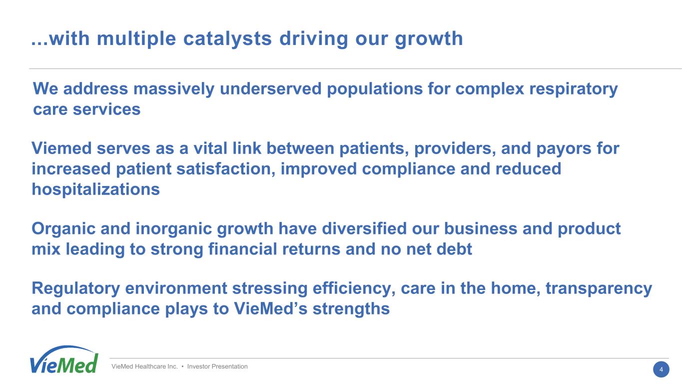 A national, innovative in-home healthcare leader... National Leader in Complex Respiratory Services Providing ventilation, sleep therapy, staffing, and other complementary products and services. Innovative At- Home Healthcare High-touch and high-tech services care model drives cost reduction, increases patient satisfaction and reduces rehospitalizations. Robust Growth and Financial Performance 27% compound annual growth rate since public listing, superior financial returns and no net debt. Extensive Nationwide Reach Serving over 153,000 patients with a capex-light business model in all 50 states. VieMed Healthcare Inc. • Investor Presentation 3