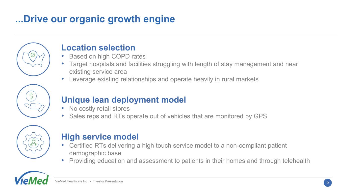 ...Drive our organic growth engine Location selection • Based on high COPD rates • Target hospitals and facilities struggling with length of stay management and near existing service area • Leverage existing relationships and operate heavily in rural markets Unique lean deployment model • No costly retail stores • Sales reps and RTs operate out of vehicles that are monitored by GPS High service model • Certified RTs delivering a high touch service model to a non-compliant patient demographic base • Providing education and assessment to patients in their homes and through telehealth VieMed Healthcare Inc. • Investor Presentation 9