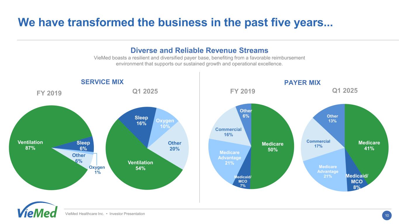 Ventilation 54% Sleep 16% Oxygen 10% Other 20% Q1 2025 Ventilation 87% Sleep 6% Oxygen 1% Other 6% Medicare 50% Medicaid/ MCO 7% Medicare Advantage 21% Commercial 16% Other 6% We have transformed the business in the past five years... SERVICE MIX PAYER MIX VieMed Healthcare Inc. • Investor Presentation Diverse and Reliable Revenue Streams VieMed boasts a resilient and diversified payer base, benefiting from a favorable reimbursement environment that supports our sustained growth and operational excellence. Q1 2025FY 2019 FY 2019 Q1 2025 10 Medicare 41% Medicaid/ MCO 8% Medicare Advantage 21% Commercial 17% Other 13%
