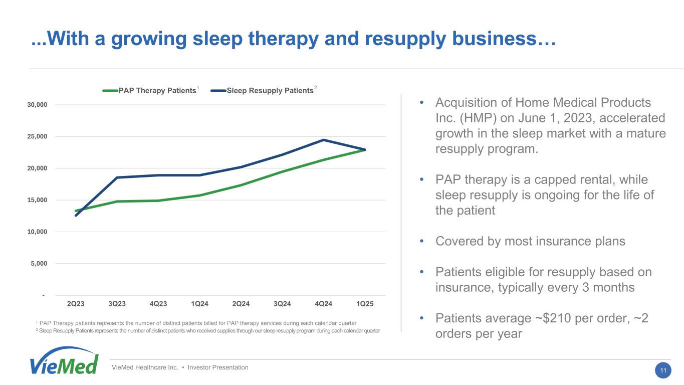 - 5,000 10,000 15,000 20,000 25,000 30,000 2Q23 3Q23 4Q23 1Q24 2Q24 3Q24 4Q24 1Q25 PAP Therapy Patients Sleep Resupply Patients VieMed Healthcare Inc. • Investor Presentation • Acquisition of Home Medical Products Inc. (HMP) on June 1, 2023, accelerated growth in the sleep market with a mature resupply program. • PAP therapy is a capped rental, while sleep resupply is ongoing for the life of the patient • Covered by most insurance plans • Patients eligible for resupply based on insurance, typically every 3 months • Patients average ~$210 per order, ~2 orders per year 1 PAP Therapy patients represents the number of distinct patients billed for PAP therapy services during each calendar quarter 2 Sleep Resupply Patients represents the number of distinct patients who received supplies through our sleep resupply program during each calendar quarter 1 2 11 ...With a growing sleep therapy and resupply business…