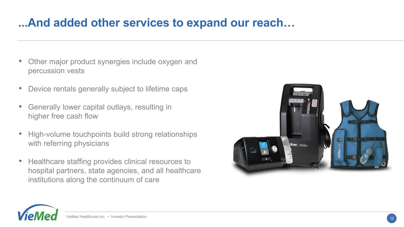 • Other major product synergies include oxygen and percussion vests • Device rentals generally subject to lifetime caps • Generally lower capital outlays, resulting in higher free cash flow • High-volume touchpoints build strong relationships with referring physicians • Healthcare staffing provides clinical resources to hospital partners, state agencies, and all healthcare institutions along the continuum of care VieMed Healthcare Inc. • Investor Presentation 12 ...And added other services to expand our reach…