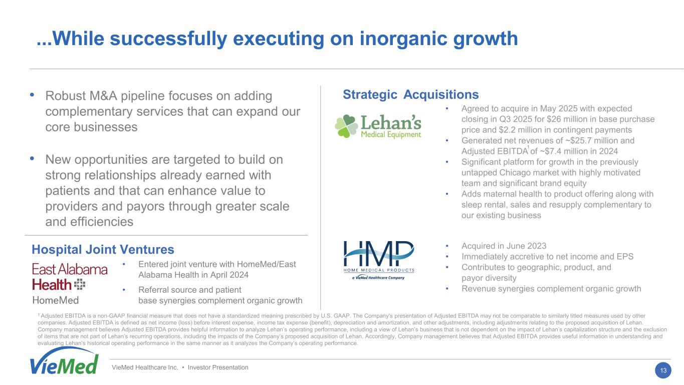 VieMed Healthcare Inc. • Investor Presentation • Robust M&A pipeline focuses on adding complementary services that can expand our core businesses • New opportunities are targeted to build on strong relationships already earned with patients and that can enhance value to providers and payors through greater scale and efficiencies • Acquired in June 2023 • Immediately accretive to net income and EPS • Contributes to geographic, product, and payor diversity • Revenue synergies complement organic growth Strategic Acquisitions Hospital Joint Ventures • Entered joint venture with HomeMed/East Alabama Health in April 2024 • Referral source and patient base synergies complement organic growth 13 ...While successfully executing on inorganic growth • Agreed to acquire in May 2025 with expected closing in Q3 2025 for $26 million in base purchase price and $2.2 million in contingent payments • Generated net revenues of ~$25.7 million and Adjusted EBITDA of ~$7.4 million in 2024 • Significant platform for growth in the previously untapped Chicago market with highly motivated team and significant brand equity • Adds maternal health to product offering along with sleep rental, sales and resupply complementary to our existing business 1 Adjusted EBITDA is a non-GAAP financial measure that does not have a standardized meaning prescribed by U.S. GAAP. The Company's presentation of Adjusted EBITDA may not be comparable to similarly titled measures used by other companies. Adjusted EBITDA is defined as net income (loss) before interest expense, income tax expense (benefit), depreciation and amortization, and other adjustments, including adjustments relating to the proposed acquisition of Lehan. Company management believes Adjusted EBITDA provides helpful information to analyze Lehan’s operating performance, including a view of Lehan’s business that is not dependent on the impact of Lehan’s capitalization structure and the exclusion of items that are not part of Lehan’s recurring operations, including the impacts of the Company’s proposed acquisition of Lehan. Accordingly, Company management believes that Adjusted EBITDA provides useful information in understanding and evaluating Lehan’s historical operating performance in the same manner as it analyzes the Company’s operating performance. 1