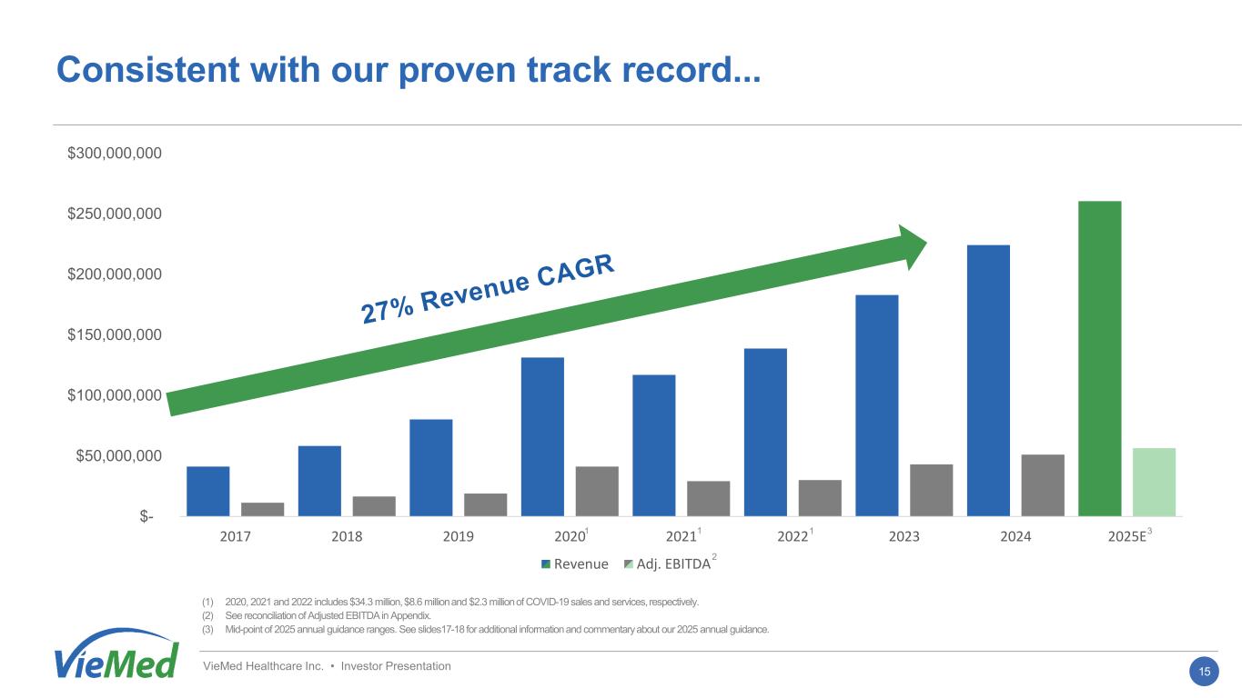 VieMed Healthcare Inc. • Investor Presentation $- $50,000,000 $100,000,000 $150,000,000 $200,000,000 $250,000,000 $300,000,000 2017 2018 2019 2020 2021 2022 2023 2024 2025E Revenue Adj. EBITDA (1) 2020, 2021 and 2022 includes $34.3 million, $8.6 million and $2.3 million of COVID-19 sales and services, respectively. (2) See reconciliation of Adjusted EBITDA in Appendix. (3) Mid-point of 2025 annual guidance ranges. See slides17-18 for additional information and commentary about our 2025 annual guidance. 1 1 1 3 2 15 Consistent with our proven track record...