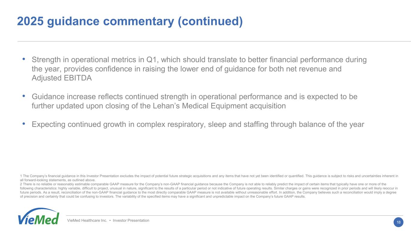 • Revenue growth was in line with our expectations • Marked improvement in each of our businesses • Benefits from the sales restructuring implemented in 2024 were evident in the non-invasive ventilation business with vent patient growth up 13% year over year • Staffing business continued its strong growth pace • PAP therapy patients were up 7% sequentially in Q1 2025 while new sleep patient starts were up 40% year over year • Strong capital position enabled us to pursue a complementary inorganic growth opportunity expected to close in Q3 2025 VieMed Healthcare Inc. • Investor Presentation 17% Net Revenue Growth 26% Increase in Adjusted EBITDA 69% Increase in Net Income 14% Net Capex $55M Credit Facility Availability 1 Compared to Q1 2024. 2 See Appendix for non-GAAP reconciliations. 3 Expressed as a percentage of net revenue. 1, 2 16 …First quarter 2025 results produced a strong start to the year... 3 $0M Net Debt 1 1