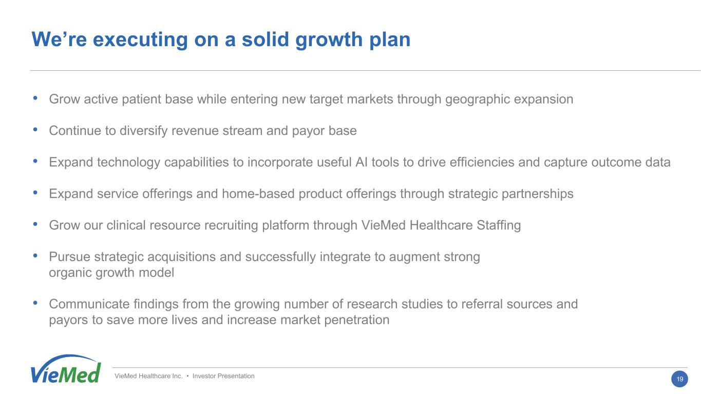 2025 guidance commentary (continued) 18 • Strength in operational metrics in Q1, which should translate to better financial performance during the year, provides confidence in raising the lower end of guidance for both net revenue and Adjusted EBITDA • Guidance increase reflects continued strength in operational performance and is expected to be further updated upon closing of the Lehan’s Medical Equipment acquisition • Expecting continued growth in complex respiratory, sleep and staffing through balance of the year VieMed Healthcare Inc. • Investor Presentation 1 The Company’s financial guidance in this Investor Presentation excludes the impact of potential future strategic acquisitions and any items that have not yet been identified or quantified. This guidance is subject to risks and uncertainties inherent in all forward-looking statements, as outlined above. 2 There is no reliable or reasonably estimable comparable GAAP measure for the Company’s non-GAAP financial guidance because the Company is not able to reliably predict the impact of certain items that typically have one or more of the following characteristics: highly variable, difficult to project, unusual in nature, significant to the results of a particular period or not indicative of future operating results. Similar charges or gains were recognized in prior periods and will likely reoccur in future periods. As a result, reconciliation of the non-GAAP financial guidance to the most directly comparable GAAP measure is not available without unreasonable effort. In addition, the Company believes such a reconciliation would imply a degree of precision and certainty that could be confusing to investors. The variability of the specified items may have a significant and unpredictable impact on the Company’s future GAAP results.