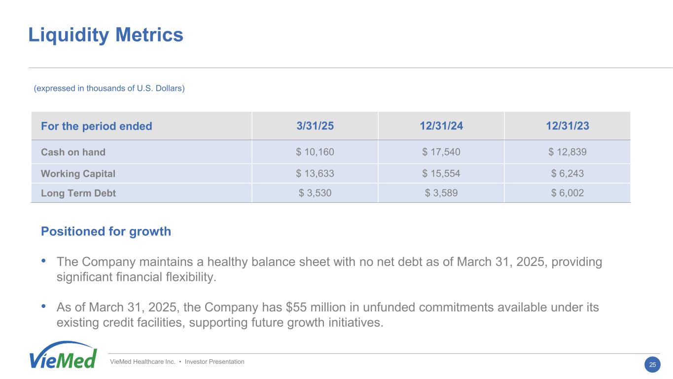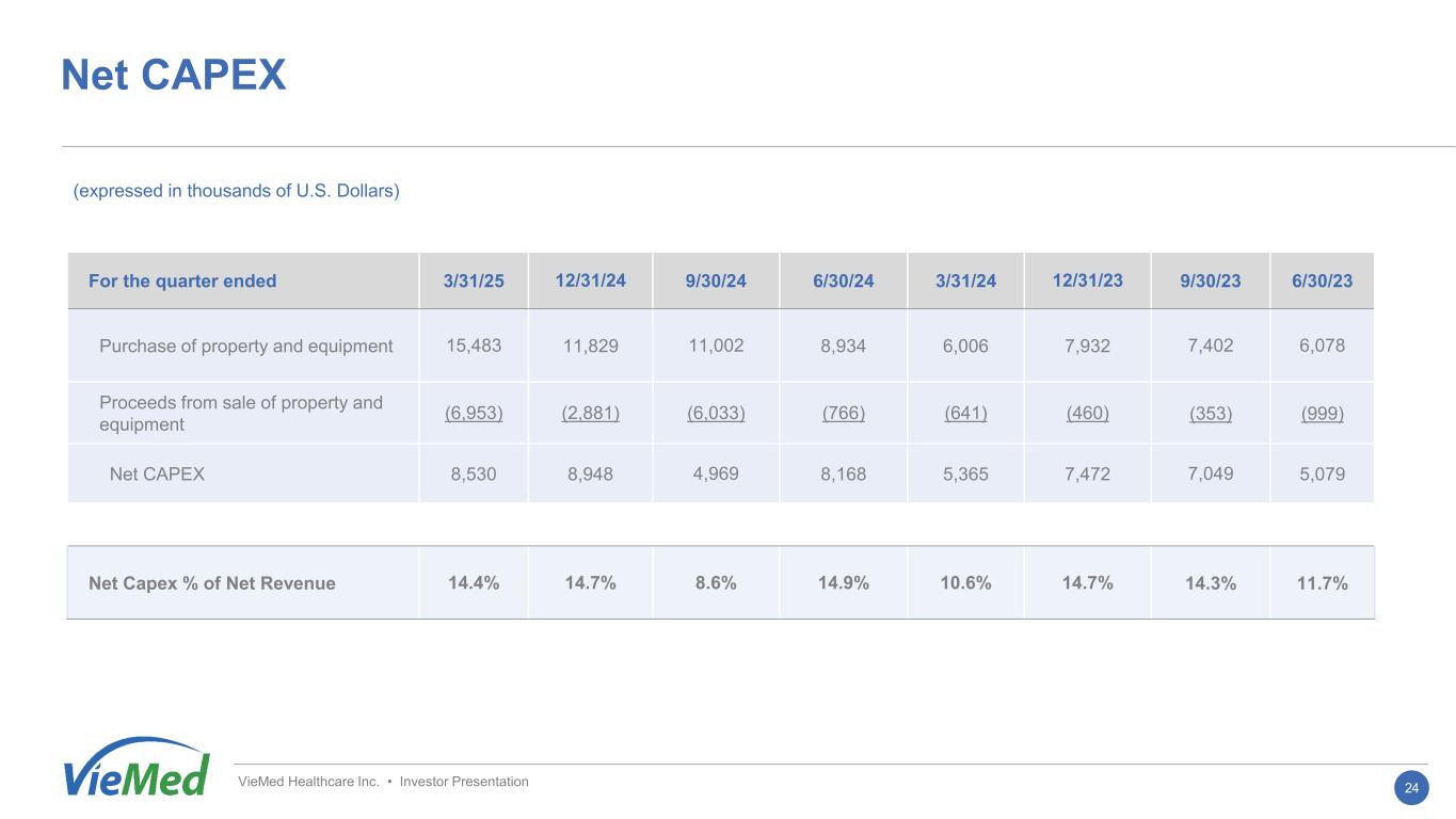 Net CAPEX 24 For the quarter ended 3/31/25 12/31/24 9/30/24 6/30/24 3/31/24 12/31/23 9/30/23 6/30/23 Purchase of property and equipment 15,483 11,829 11,002 8,934 6,006 7,932 7,402 6,078 Proceeds from sale of property and equipment (6,953) (2,881) (6,033) (766) (641) (460) (353) (999) Net CAPEX 8,530 8,948 4,969 8,168 5,365 7,472 7,049 5,079 Net Capex % of Net Revenue 14.4% 14.7% 8.6% 14.9% 10.6% 14.7% 14.3% 11.7% VieMed Healthcare Inc. • Investor Presentation (expressed in thousands of U.S. Dollars)