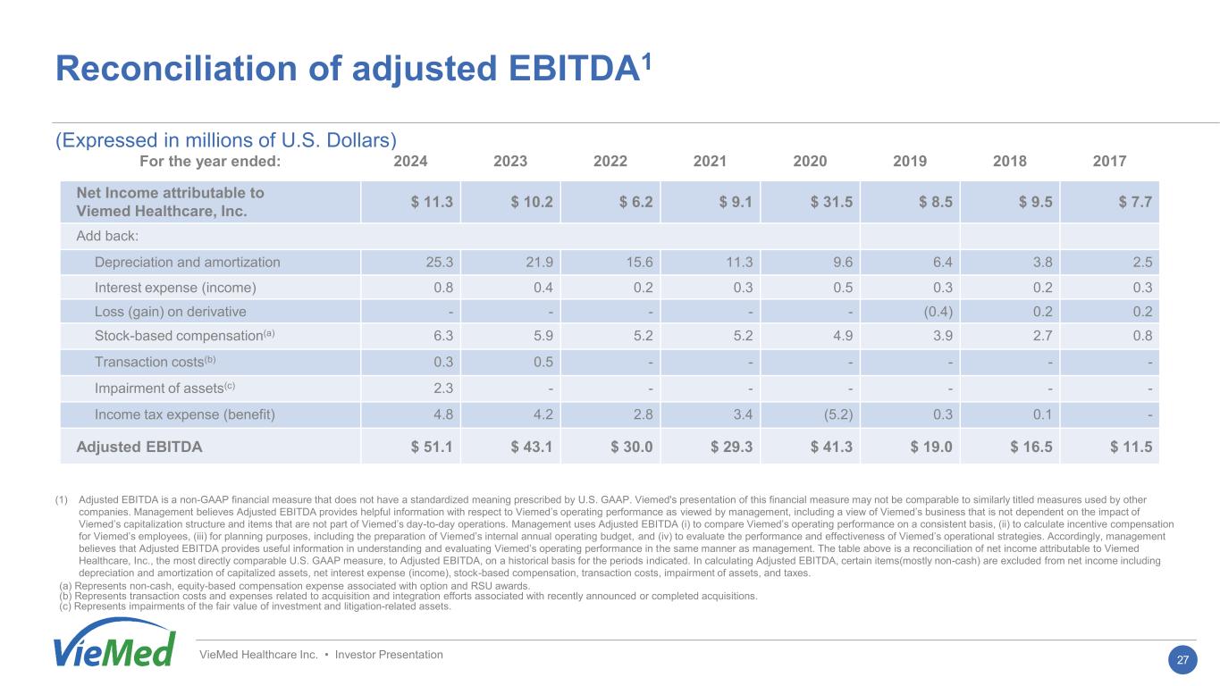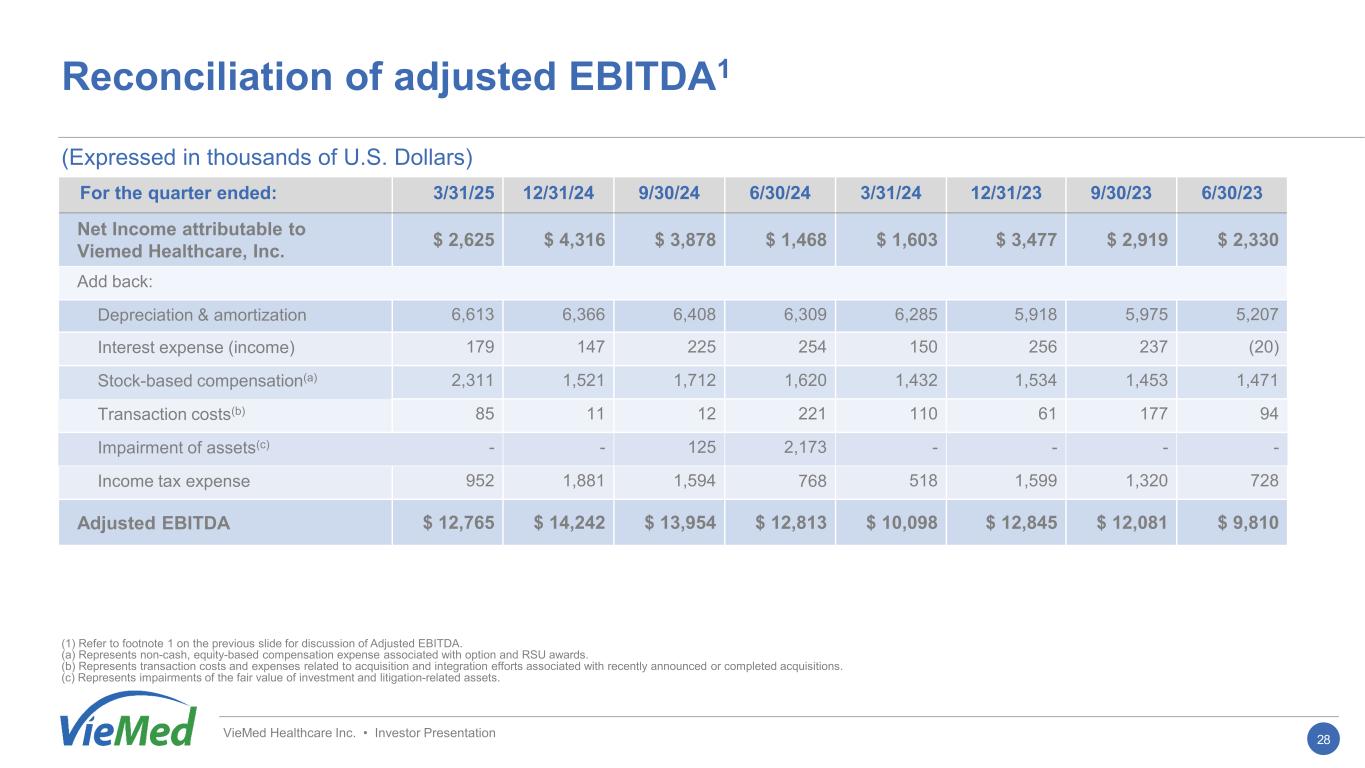 Reconciliation of adjusted EBITDA1 (a) Represents non-cash, equity-based compensation expense associated with option and RSU awards. (b) Represents transaction costs and expenses related to acquisition and integration efforts associated with recently announced or completed acquisitions. (c) Represents impairments of the fair value of investment and litigation-related assets. (Expressed in millions of U.S. Dollars) For the year ended: 2024 2023 2022 2021 2020 2019 2018 2017 Net Income attributable to Viemed Healthcare, Inc. $ 11.3 $ 10.2 $ 6.2 $ 9.1 $ 31.5 $ 8.5 $ 9.5 $ 7.7 Add back: Depreciation and amortization 25.3 21.9 15.6 11.3 9.6 6.4 3.8 2.5 Interest expense (income) 0.8 0.4 0.2 0.3 0.5 0.3 0.2 0.3 Loss (gain) on derivative - - - - - (0.4) 0.2 0.2 Stock-based compensation(a) 6.3 5.9 5.2 5.2 4.9 3.9 2.7 0.8 Transaction costs(b) 0.3 0.5 - - - - - - Impairment of assets(c) 2.3 - - - - - - - Income tax expense (benefit) 4.8 4.2 2.8 3.4 (5.2) 0.3 0.1 - Adjusted EBITDA $ 51.1 $ 43.1 $ 30.0 $ 29.3 $ 41.3 $ 19.0 $ 16.5 $ 11.5 VieMed Healthcare Inc. • Investor Presentation (1) Adjusted EBITDA is a non-GAAP financial measure that does not have a standardized meaning prescribed by U.S. GAAP. Viemed's presentation of this financial measure may not be comparable to similarly titled measures used by other companies. Management believes Adjusted EBITDA provides helpful information with respect to Viemed’s operating performance as viewed by management, including a view of Viemed’s business that is not dependent on the impact of Viemed’s capitalization structure and items that are not part of Viemed’s day-to-day operations. Management uses Adjusted EBITDA (i) to compare Viemed’s operating performance on a consistent basis, (ii) to calculate incentive compensation for Viemed’s employees, (iii) for planning purposes, including the preparation of Viemed’s internal annual operating budget, and (iv) to evaluate the performance and effectiveness of Viemed’s operational strategies. Accordingly, management believes that Adjusted EBITDA provides useful information in understanding and evaluating Viemed’s operating performance in the same manner as management. The table above is a reconciliation of net income attributable to Viemed Healthcare, Inc., the most directly comparable U.S. GAAP measure, to Adjusted EBITDA, on a historical basis for the periods indicated. In calculating Adjusted EBITDA, certain items(mostly non-cash) are excluded from net income including depreciation and amortization of capitalized assets, net interest expense (income), stock-based compensation, transaction costs, impairment of assets, and taxes. 27