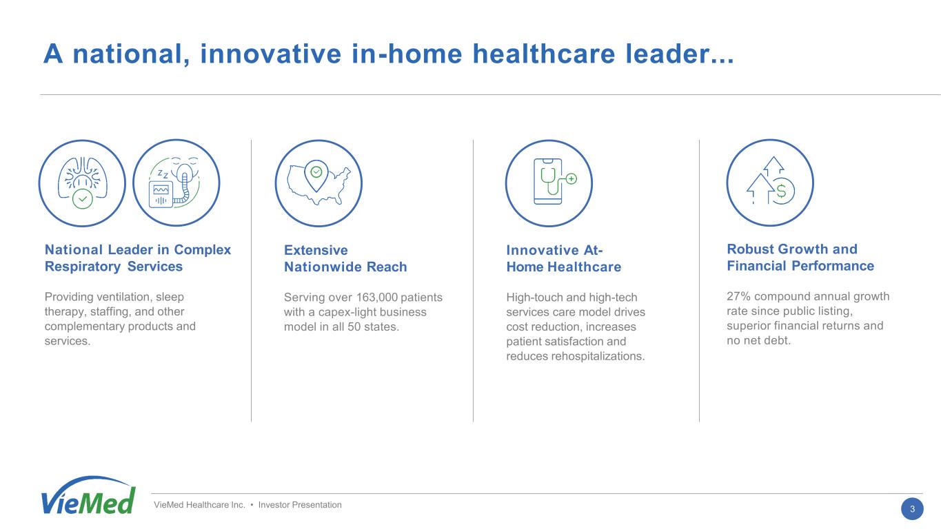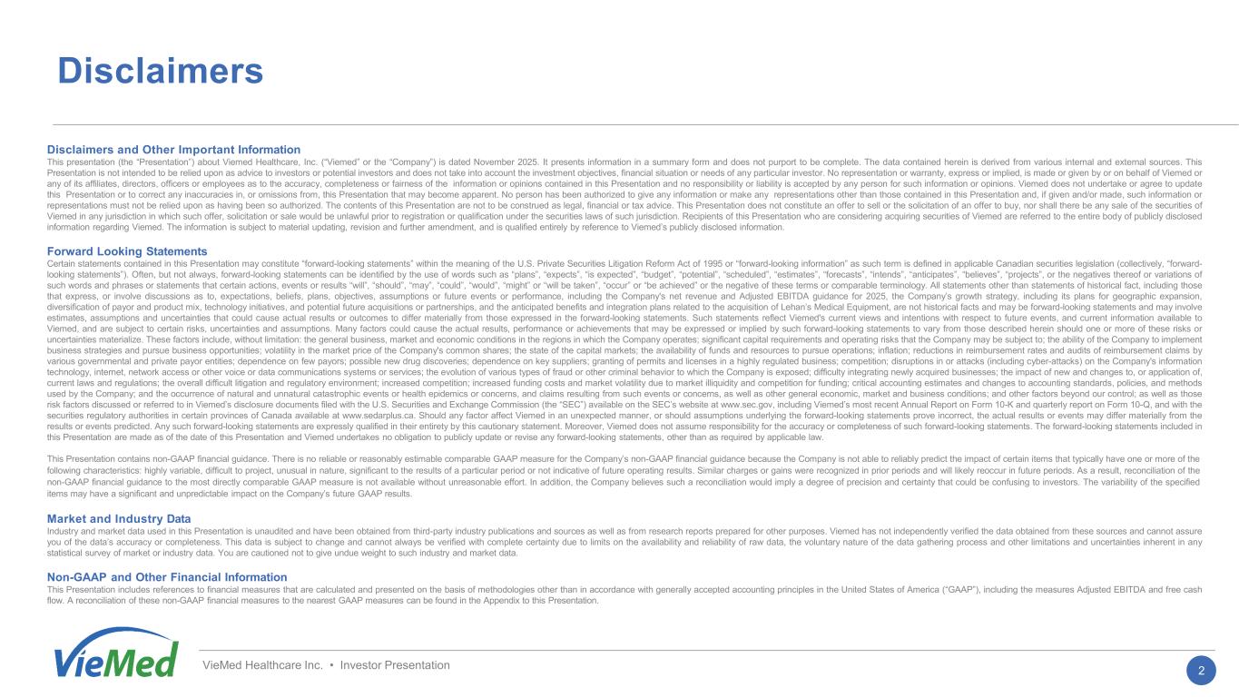 Disclaimers VieMed Healthcare Inc. • Investor Presentation Disclaimers and Other Important Information This presentation (the “Presentation”) about Viemed Healthcare, Inc. (“Viemed” or the “Company”) is dated November 2025. It presents information in a summary form and does not purport to be complete. The data contained herein is derived from various internal and external sources. This Presentation is not intended to be relied upon as advice to investors or potential investors and does not take into account the investment objectives, financial situation or needs of any particular investor. No representation or warranty, express or implied, is made or given by or on behalf of Viemed or any of its affiliates, directors, officers or employees as to the accuracy, completeness or fairness of the information or opinions contained in this Presentation and no responsibility or liability is accepted by any person for such information or opinions. Viemed does not undertake or agree to update this Presentation or to correct any inaccuracies in, or omissions from, this Presentation that may become apparent. No person has been authorized to give any information or make any representations other than those contained in this Presentation and, if given and/or made, such information or representations must not be relied upon as having been so authorized. The contents of this Presentation are not to be construed as legal, financial or tax advice. This Presentation does not constitute an offer to sell or the solicitation of an offer to buy, nor shall there be any sale of the securities of Viemed in any jurisdiction in which such offer, solicitation or sale would be unlawful prior to registration or qualification under the securities laws of such jurisdiction. Recipients of this Presentation who are considering acquiring securities of Viemed are referred to the entire body of publicly disclosed information regarding Viemed. The information is subject to material updating, revision and further amendment, and is qualified entirely by reference to Viemed’s publicly disclosed information. Forward Looking Statements Certain statements contained in this Presentation may constitute “forward-looking statements” within the meaning of the U.S. Private Securities Litigation Reform Act of 1995 or “forward-looking information” as such term is defined in applicable Canadian securities legislation (collectively, “forward- looking statements”). Often, but not always, forward-looking statements can be identified by the use of words such as “plans”, “expects”, “is expected”, “budget”, “potential”, “scheduled”, “estimates”, “forecasts”, “intends”, “anticipates”, “believes”, “projects”, or the negatives thereof or variations of such words and phrases or statements that certain actions, events or results “will”, “should”, “may”, “could”, “would”, “might” or “will be taken”, “occur” or “be achieved” or the negative of these terms or comparable terminology. All statements other than statements of historical fact, including those that express, or involve discussions as to, expectations, beliefs, plans, objectives, assumptions or future events or performance, including the Company's net revenue and Adjusted EBITDA guidance for 2025, the Company’s growth strategy, including its plans for geographic expansion, diversification of payor and product mix, technology initiatives, and potential future acquisitions or partnerships, and the anticipated benefits and integration plans related to the acquisition of Lehan’s Medical Equipment, are not historical facts and may be forward-looking statements and may involve estimates, assumptions and uncertainties that could cause actual results or outcomes to differ materially from those expressed in the forward-looking statements. Such statements reflect Viemed's current views and intentions with respect to future events, and current information available to Viemed, and are subject to certain risks, uncertainties and assumptions. Many factors could cause the actual results, performance or achievements that may be expressed or implied by such forward-looking statements to vary from those described herein should one or more of these risks or uncertainties materialize. These factors include, without limitation: the general business, market and economic conditions in the regions in which the Company operates; significant capital requirements and operating risks that the Company may be subject to; the ability of the Company to implement business strategies and pursue business opportunities; volatility in the market price of the Company's common shares; the state of the capital markets; the availability of funds and resources to pursue operations; inflation; reductions in reimbursement rates and audits of reimbursement claims by various governmental and private payor entities; dependence on few payors; possible new drug discoveries; dependence on key suppliers; granting of permits and licenses in a highly regulated business; competition; disruptions in or attacks (including cyber-attacks) on the Company's information technology, internet, network access or other voice or data communications systems or services; the evolution of various types of fraud or other criminal behavior to which the Company is exposed; difficulty integrating newly acquired businesses; the impact of new and changes to, or application of, current laws and regulations; the overall difficult litigation and regulatory environment; increased competition; increased funding costs and market volatility due to market illiquidity and competition for funding; critical accounting estimates and changes to accounting standards, policies, and methods used by the Company; and the occurrence of natural and unnatural catastrophic events or health epidemics or concerns, and claims resulting from such events or concerns, as well as othe