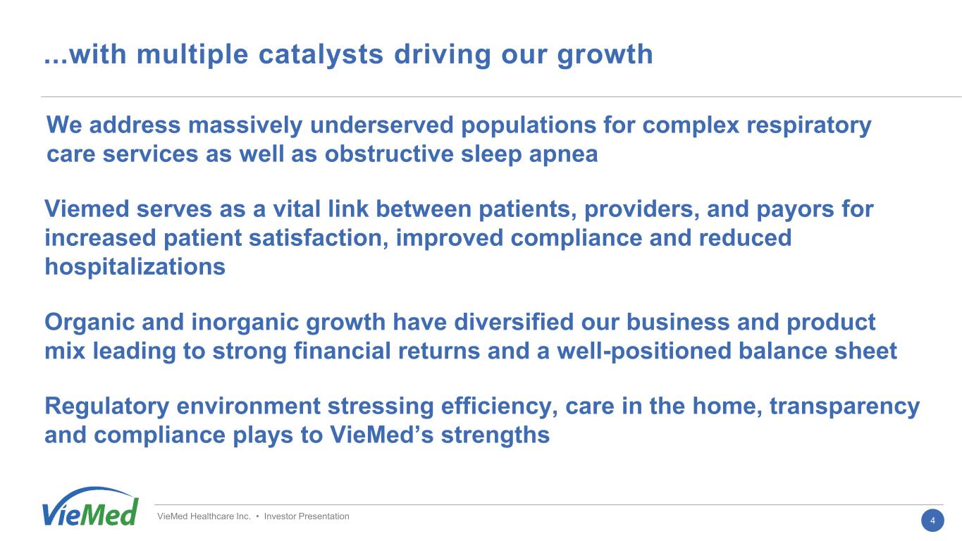 A national, innovative in-home healthcare leader... National Leader in Complex Respiratory Services Providing ventilation, sleep therapy, staffing, and other complementary products and services. Innovative At- Home Healthcare High-touch and high-tech services care model drives cost reduction, increases patient satisfaction and reduces rehospitalizations. Robust Growth and Financial Performance 27% compound annual growth rate since public listing, superior financial returns and no net debt. Extensive Nationwide Reach Serving over 163,000 patients with a capex-light business model in all 50 states. VieMed Healthcare Inc. • Investor Presentation 3