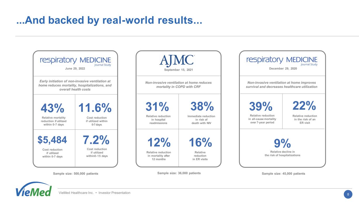 ...And backed by real-world results... VieMed Healthcare Inc. • Investor Presentation Non-invasive ventilation at home reduces mortality in COPD with CRF September 15, 2021 December 29, 2020June 29, 2022 Sample size: 500,000 patients Sample size: 36,000 patients Sample size: 45,000 patients 43% Relative mortality reduction if utilized within 0-7 days 11.6% Cost reduction if utilized within 0-7 days 7.2% Cost reduction if utilized within0-15 days $5,484 Cost reduction if utilized within 0-7 days Early initiation of non-invasive ventilation at home reduces mortality, hospitalizations, and overall health costs Non-invasive ventilation at home reduces mortality in COPD with CRF 31% Relative reduction in hospital readmissions 38% Immediate reduction in risk of death with NIV 12% Relative reduction in mortality after 12 months 16% Relative reduction in ER visits Non-invasive ventilation at home improves survival and decreases healthcare utilization 39% Relative reduction in all-cause mortality over 7-year period 9% Relative decline in the risk of hospitalizations 22% Relative reduction in the risk of an ER visit 8