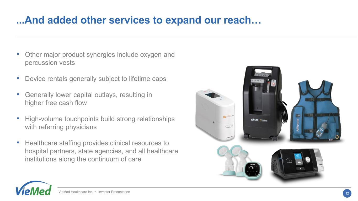 - 5,000 10,000 15,000 20,000 25,000 30,000 35,000 40,000 4Q23 1Q24 2Q24 3Q24 4Q24 1Q25 2Q25 3Q25 PAP Therapy Patients Sleep Resupply Patients VieMed Healthcare Inc. • Investor Presentation • Acquisition of Home Medical Products Inc. (HMP) on June 1, 2023, accelerated growth in the sleep market with a mature resupply program. • PAP therapy is a capped rental, while sleep resupply is ongoing for the life of the patient • Covered by most insurance plans • Patients eligible for resupply based on insurance, typically every 3 months • Patients average ~$210 per order, ~2 orders per year 1 PAP Therapy patients represents the number of distinct patients billed for PAP therapy services during each calendar quarter 2 Sleep Resupply Patients represents the number of distinct patients who received supplies through our sleep resupply program during each calendar quarter 1 2 11 ...With a growing sleep therapy and resupply business…