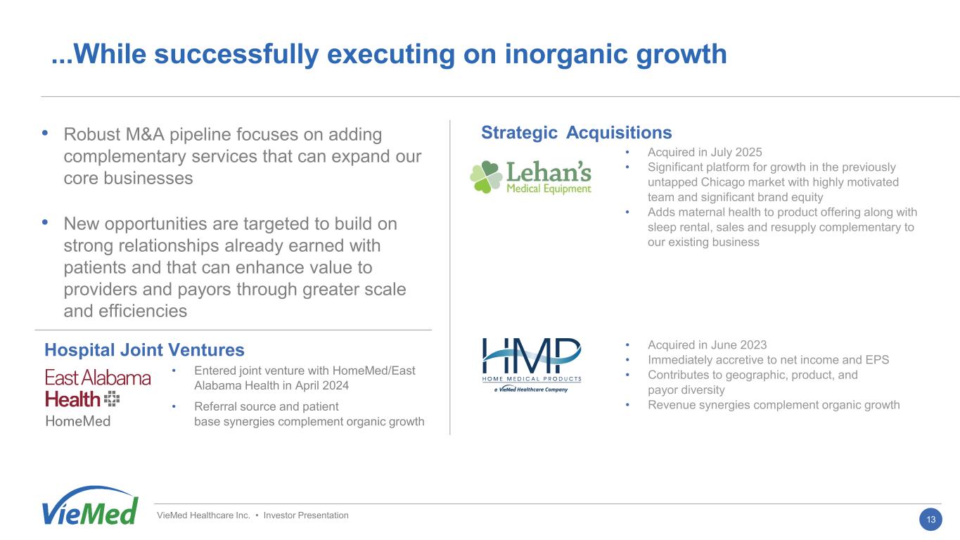 VieMed Healthcare Inc. • Investor Presentation • Robust M&A pipeline focuses on adding complementary services that can expand our core businesses • New opportunities are targeted to build on strong relationships already earned with patients and that can enhance value to providers and payors through greater scale and efficiencies • Acquired in June 2023 • Immediately accretive to net income and EPS • Contributes to geographic, product, and payor diversity • Revenue synergies complement organic growth Strategic Acquisitions Hospital Joint Ventures • Entered joint venture with HomeMed/East Alabama Health in April 2024 • Referral source and patient base synergies complement organic growth 13 ...While successfully executing on inorganic growth • Acquired in July 2025 • Significant platform for growth in the previously untapped Chicago market with highly motivated team and significant brand equity • Adds maternal health to product offering along with sleep rental, sales and resupply complementary to our existing business