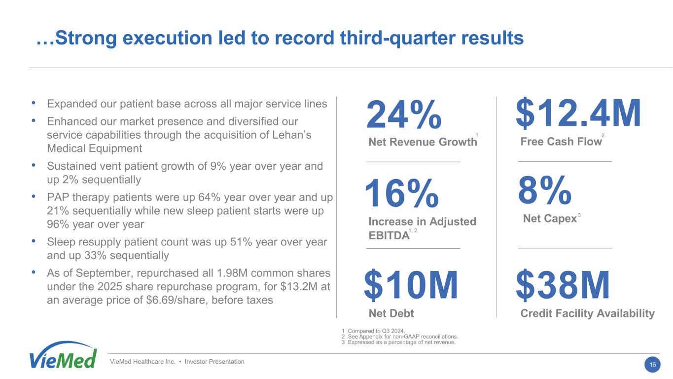 VieMed Healthcare Inc. • Investor Presentation $- $50,000,000 $100,000,000 $150,000,000 $200,000,000 $250,000,000 $300,000,000 2017 2018 2019 2020 2021 2022 2023 2024 2025E Revenue Adj. EBITDA (1) 2020, 2021 and 2022 includes $34.3 million, $8.6 million and $2.3 million of COVID-19 sales and services, respectively. (2) See reconciliation of Adjusted EBITDA in Appendix. (3) Mid-point of 2025 annual guidance ranges. See slide 17 for additional information and commentary about our 2025 annual guidance. 1 1 1 3 2 15 Consistent with our proven track record...