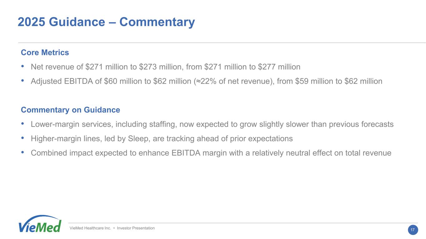 • Expanded our patient base across all major service lines • Enhanced our market presence and diversified our service capabilities through the acquisition of Lehan’s Medical Equipment • Sustained vent patient growth of 9% year over year and up 2% sequentially • PAP therapy patients were up 64% year over year and up 21% sequentially while new sleep patient starts were up 96% year over year • Sleep resupply patient count was up 51% year over year and up 33% sequentially • As of September, repurchased all 1.98M common shares under the 2025 share repurchase program, for $13.2M at an average price of $6.69/share, before taxes VieMed Healthcare Inc. • Investor Presentation 24% Net Revenue Growth 16% Increase in Adjusted EBITDA $12.4M Free Cash Flow 8% Net Capex $38M Credit Facility Availability 1 Compared to Q3 2024. 2 See Appendix for non-GAAP reconciliations. 3 Expressed as a percentage of net revenue. 1, 2 16 …Strong execution led to record third-quarter results 3 $10M Net Debt 1 2