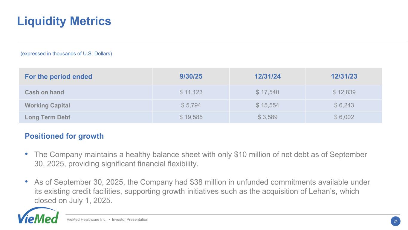 Liquidity Metrics 24 Positioned for growth • The Company maintains a healthy balance sheet with only $10 million of net debt as of September 30, 2025, providing significant financial flexibility. • As of September 30, 2025, the Company had $38 million in unfunded commitments available under its existing credit facilities, supporting growth initiatives such as the acquisition of Lehan’s, which closed on July 1, 2025. For the period ended 9/30/25 12/31/24 12/31/23 Cash on hand $ 11,123 $ 17,540 $ 12,839 Working Capital $ 5,794 $ 15,554 $ 6,243 Long Term Debt $ 19,585 $ 3,589 $ 6,002 VieMed Healthcare Inc. • Investor Presentation (expressed in thousands of U.S. Dollars)