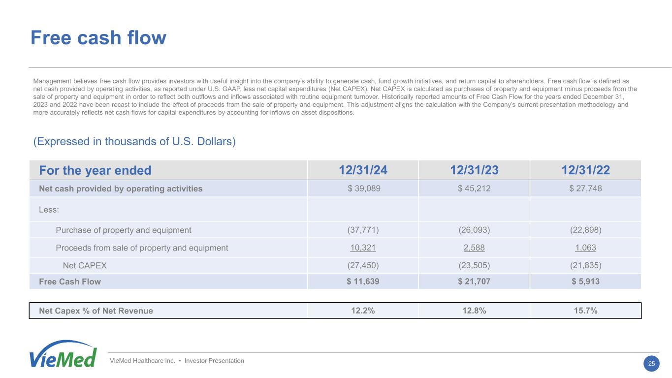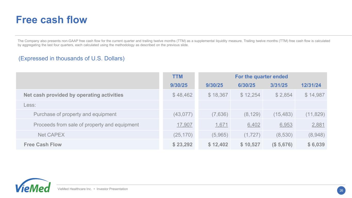 Free cash flow 25 For the year ended 12/31/24 12/31/23 12/31/22 Net cash provided by operating activities $ 39,089 $ 45,212 $ 27,748 Less: Purchase of property and equipment (37,771) (26,093) (22,898) Proceeds from sale of property and equipment 10,321 2,588 1,063 Net CAPEX (27,450) (23,505) (21,835) Free Cash Flow $ 11,639 $ 21,707 $ 5,913 Net Capex % of Net Revenue 12.2% 12.8% 15.7% VieMed Healthcare Inc. • Investor Presentation Management believes free cash flow provides investors with useful insight into the company’s ability to generate cash, fund growth initiatives, and return capital to shareholders. Free cash flow is defined as net cash provided by operating activities, as reported under U.S. GAAP, less net capital expenditures (Net CAPEX). Net CAPEX is calculated as purchases of property and equipment minus proceeds from the sale of property and equipment in order to reflect both outflows and inflows associated with routine equipment turnover. Historically reported amounts of Free Cash Flow for the years ended December 31, 2023 and 2022 have been recast to include the effect of proceeds from the sale of property and equipment. This adjustment aligns the calculation with the Company’s current presentation methodology and more accurately reflects net cash flows for capital expenditures by accounting for inflows on asset dispositions. (Expressed in thousands of U.S. Dollars)
