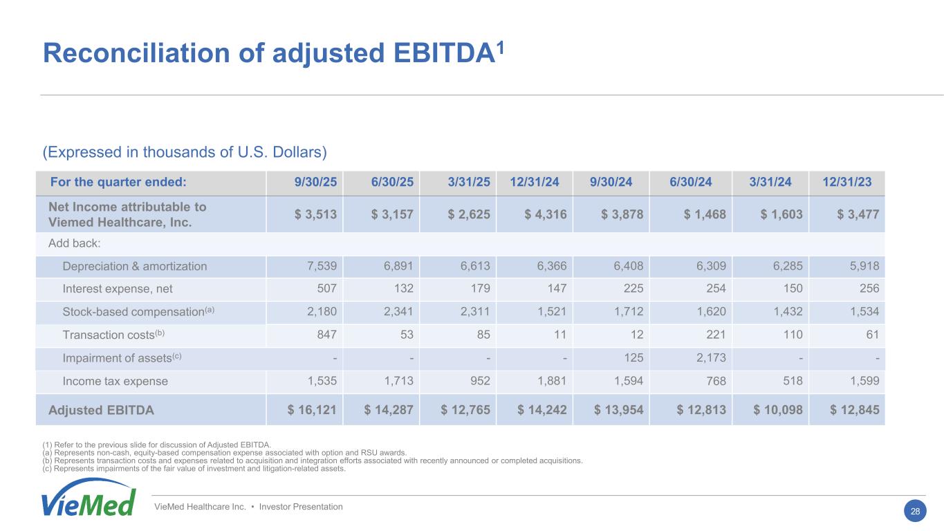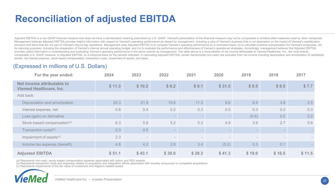 Reconciliation of adjusted EBITDA (a) Represents non-cash, equity-based compensation expense associated with option and RSU awards. (b) Represents transaction costs and expenses related to acquisition and integration efforts associated with recently announced or completed acquisitions. (c) Represents impairments of the fair value of investment and litigation-related assets. (Expressed in millions of U.S. Dollars) For the year ended: 2024 2023 2022 2021 2020 2019 2018 2017 Net Income attributable to Viemed Healthcare, Inc. $ 11.3 $ 10.2 $ 6.2 $ 9.1 $ 31.5 $ 8.5 $ 9.5 $ 7.7 Add back: Depreciation and amortization 25.3 21.9 15.6 11.3 9.6 6.4 3.8 2.5 Interest expense, net 0.8 0.4 0.2 0.3 0.5 0.3 0.2 0.3 Loss (gain) on derivative - - - - - (0.4) 0.2 0.2 Stock-based compensation(a) 6.3 5.9 5.2 5.2 4.9 3.9 2.7 0.8 Transaction costs(b) 0.3 0.5 - - - - - - Impairment of assets(c) 2.3 - - - - - - - Income tax expense (benefit) 4.8 4.2 2.8 3.4 (5.2) 0.3 0.1 - Adjusted EBITDA $ 51.1 $ 43.1 $ 30.0 $ 29.3 $ 41.3 $ 19.0 $ 16.5 $ 11.5 VieMed Healthcare Inc. • Investor Presentation Adjusted EBITDA is a non-GAAP financial measure that does not have a standardized meaning prescribed by U.S. GAAP. Viemed's presentation of this financial measure may not be comparable to similarly titled measures used by other companies. Management believes Adjusted EBITDA provides helpful information with respect to Viemed’s operating performance as viewed by management, including a view of Viemed’s business that is not dependent on the impact of Viemed’s capitalization structure and items that are not part of Viemed’s day-to-day operations. Management uses Adjusted EBITDA (i) to compare Viemed’s operating performance on a consistent basis, (ii) to calculate incentive compensation for Viemed’s employees, (iii) for planning purposes, including the preparation of Viemed’s internal annual operating budget, and (iv) to evaluate the performance and effectiveness of Viemed’s operational strategies. Accordingly, management believes that Adjusted EBITDA provides useful information in understanding and evaluating Viemed’s operating performance in the same manner as management. The table above is a reconciliation of net income attributable to Viemed Healthcare, Inc., the most directly comparable U.S. GAAP measure, to Adjusted EBITDA, on a historical basis for the periods indicated. In calculating Adjusted EBITDA, certain items(mostly non-cash) are excluded from net income including depreciation and amortization of capitalized assets, net interest expense, stock-based compensation, transaction costs, impairment of assets, and taxes. 27