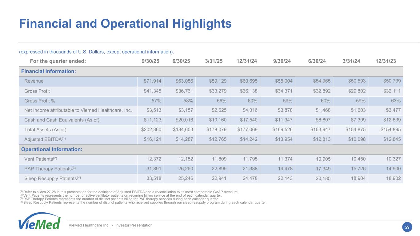 28 (1) Refer to the previous slide for discussion of Adjusted EBITDA. (a) Represents non-cash, equity-based compensation expense associated with option and RSU awards. (b) Represents transaction costs and expenses related to acquisition and integration efforts associated with recently announced or completed acquisitions. (c) Represents impairments of the fair value of investment and litigation-related assets. For the quarter ended: 9/30/25 6/30/25 3/31/25 12/31/24 9/30/24 6/30/24 3/31/24 12/31/23 Net Income attributable to Viemed Healthcare, Inc. $ 3,513 $ 3,157 $ 2,625 $ 4,316 $ 3,878 $ 1,468 $ 1,603 $ 3,477 Add back: Depreciation & amortization 7,539 6,891 6,613 6,366 6,408 6,309 6,285 5,918 Interest expense, net 507 132 179 147 225 254 150 256 Stock-based compensation(a) 2,180 2,341 2,311 1,521 1,712 1,620 1,432 1,534 Transaction costs(b) 847 53 85 11 12 221 110 61 Impairment of assets(c) - - - - 125 2,173 - - Income tax expense 1,535 1,713 952 1,881 1,594 768 518 1,599 Adjusted EBITDA $ 16,121 $ 14,287 $ 12,765 $ 14,242 $ 13,954 $ 12,813 $ 10,098 $ 12,845 VieMed Healthcare Inc. • Investor Presentation (Expressed in thousands of U.S. Dollars) Reconciliation of adjusted EBITDA1