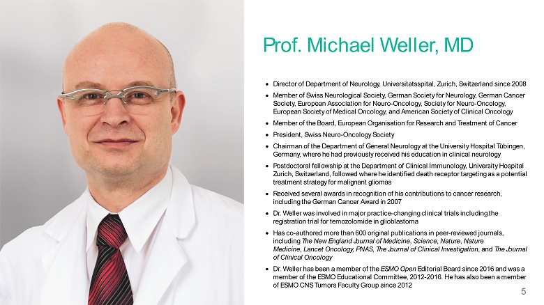 5 Prof. Michael Weller, MD  Director of Department of Neurology, Universitatsspital, Zurich, Switzerland since 2008  Member of Swiss Neurological Society, German Society for Neurology, German Cancer Society, European Association for Neuro - Oncology, Society for Neuro - Oncology, European Society of Medical Oncology, and American Society of Clinical Oncology  Member of the Board, European Organisation for Research and Treatment of Cancer  President, Swiss Neuro - Oncology Society  Chairman of the Department of General Neurology at the University Hospital Tübingen, Germany, where he had previously received his education in clinical neurology  Postdoctoral fellowship at the Department of Clinical Immunology, University Hospital Zurich, Switzerland, followed where he identified death receptor targeting as a potential treatment strategy for malignant gliomas  Received several awards in recognition of his contributions to cancer research, including the German Cancer Award in 2007  Dr. Weller was involved in major practice - changing clinical trials including the registration trial for temozolomide in glioblastoma  Has co - authored more than 600 original publications in peer - reviewed journals, including The New England Journal of Medicine , Science , Nature , Nature Medicine , Lancet Oncology, PNAS , The Journal of Clinical Investigation , and The Journal of Clinical Oncology  Dr. Weller has been a member of the ESMO Open Editorial Board since 2016 and was a member of the ESMO Educational Committee, 2012 - 2016. He has also been a member of ESMO CNS Tumors Faculty Group since 2012