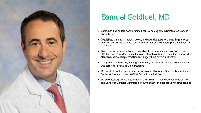 Samuel Goldlust, MD 6  B oard - certified and fellowship - trained neuro oncologist with Saint Luke’s Cancer Specialists  Specialized training in neuro - oncology and extensive experience treating patients with primary and metastatic brain tumors as well as the neurological complications of cancer  Passionate about research and focused on the development of novel and more effective treatments for glioblastoma and other brain tumors, including options when standard chemotherapy, radiation and surgery have proven ineffective  Completed his residency training in neurology at New York University Hospitals and was selected to serve as Chief R esident  Received fellowship training in neuro - oncology at Memorial Sloan Kettering Cancer Center and was promoted to Chief F ellow in his final year  Dr. Goldlust frequently treats conditions like Brain Cancer, Hypothalamus Cancer and Cancer of Cerebral Meninges along with other conditions at varying frequencies