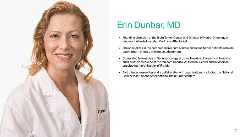 7 Erin Dunbar, MD  Founding physician of the Brain Tumor Center and Director of Neuro - Oncology at Piedmont Atlanta Hospital, Piedmont Atlanta, GA  She specializes in the comprehensive care of brain and spine tumor patients who are battling both primary and metastatic tumors  Completed fellowships in Neuro - oncology at Johns Hopkins University, in Hospice and Palliative Medicine at the Malcom Randall VA Medical Center and in Medical - oncology at the University of Florida  Avid clinical researcher and a collaborator with organizations, including the National Cancer Institute and other national brain tumor centers
