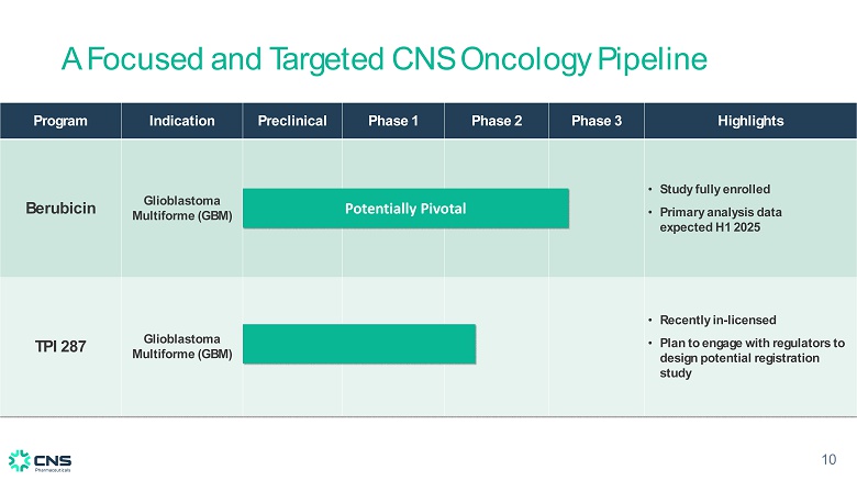 Overview Lead Program: Berubicin, a Novel Anthracycline • First drug of its class to appear to cross the blood - brain barrier • A clinical trial designed to be pivotal now f u l ly enrolled • The primary analysis of data in the 1 st half of 2025 • No evidence of cardiotoxicity in hundreds of patients • Developed at MD Anderson Cancer Center – Ranked #1 in Cancer Care in the US 9 Pipeline Expansion with In - License of TPI 287 • Late - stage, novel, blood brain - barrier permeable taxane - derivative (abeotaxane) for treatment of brain malignancies • Studies in over 350 patients to date, include clinical trials as monotherapy and combination with bevacizumab • Orphan Designation for 7 years granting US marketing exclusivity • Fast Track Designation expediting review of data