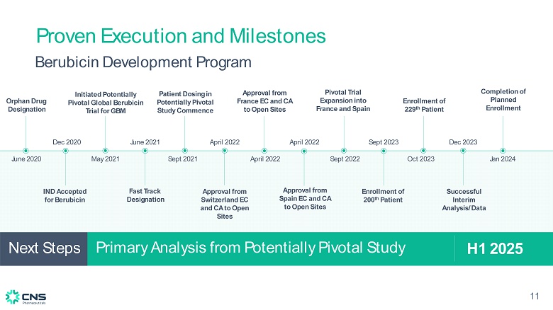 A Focused and Targeted CNS Oncology Pipeline 10 Highlights Phase 3 Phase 2 Phase 1 Preclinical Indication Program • Study fully enrolled • Primary analysis data expected H1 2025 Glioblastoma Multiforme (GBM) Berubicin • Recently in - licensed • Plan to engage with regulators to design potential registration study Glioblastoma Multiforme (GBM) TPI 287 Potentially Pivotal