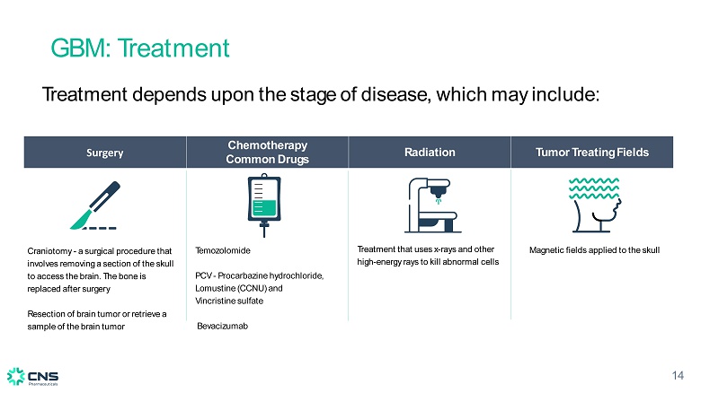 Glioblastoma Multiforme (GBM) 13 1: https://braintumor.org/take - action/about - gbm/ 2: 8 Major Markets includes USA, France, Germany, Italy, Spain, UK, Japan and urban China 3: Global Data, “Glioblastoma Multiforme (GBM): Opportunity Analysis and Forecasts to 2027” (2017) One of the most aggressive, deadly and treatment - resistant cancers that forms in the brain Current standard of care ineffective in ~60% of patients Can affect cognition, mood, behavior and organ function 12 – 18 MONTHS Average Life E xpectancy 1 >50,000 New Cases in the 8 Major Markets 2 Each Y ear 3 ~48% Of All P rimary M alignant Brain T umors 1 >151,000 Forecast of Annual New Cases in the 8 Major Markets 2 by 2027 3