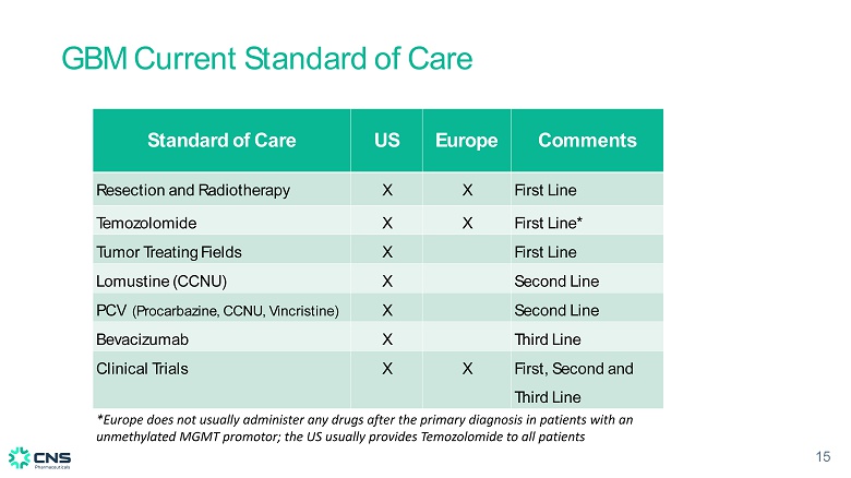 GBM Current Standard of Care 15 *Europe does not usually administer any drugs after the primary diagnosis in patients with an unmethylated MGMT promotor; the US usually provides Temozolomide to all patients Comments Europe US Standard of Care First Line X X Resection and Radiotherapy First Line* X X Temozolomide First Line X Tumor Treating Fields Second Line X Lomustine (CCNU) Second Line X PCV (Procarbazine, CCNU, Vincristine) Third Line X Bevacizumab First, Second and Third Line X X Clinical Trials