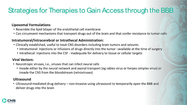 17 The Blood Brain Barrier (BBB) Key Functions • Protection: • Blocks toxins, pathogens and potentially harmful molecules from entering the brain by transporters that bind to these substances and deliver them back to the bloodstream • Selective Permeability : • Allows essential nutrients like glucose and amino acids to pass through while restricting larger or harmful molecules • Maintaining Homeostasis : • Ensures a controlled environment for proper neuronal function Highly Selective, Semi - Permeable Barrier that Separates the Circulating Blood from the Brain Drug Delivery to the Brain is Challenging Due to the BBB’s Selective Nature, Limiting the Access and Effectiveness of Cancer Therapies in the Brain
