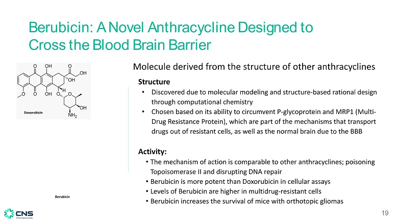 Berubicin: A Novel Anthracycline Designed to Cross the Blood Brain Barrier 19 Molecule derived from the structure of other anthracyclines Structure • Discovered due to molecular modeling and structure - based rational design through computational chemistry • Chosen based on its ability to circumvent P - glycoprotein and MRP1 (Multi - Drug Resistance Protein), which are part of the mechanisms that transport drugs out of resistant cells, as well as the normal brain due to the BBB Activity: • The mechanism of action is comparable to other anthracyclines; poisoning Topoisomerase II and disrupting DNA repair • Berubicin is more potent than Doxorubicin in cellular assays • Levels of Berubicin are higher in multidrug - resistant cells • Berubicin increases the survival of mice with orthotopic gliomas Berubicin Doxorubicin