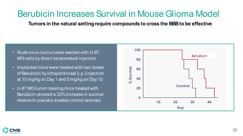 20 Berubicin Increases Survival in Mouse Glioma Model • N ude mice ( nu/nu ) were seeded with U - 87 MG cells by direct intracerebral injection • Implanted mice were treated with two doses of Berubicin by intraperitoneal (i.p.) injection at 10 mg/kg on Day 1 and 5 mg/kg on Day 10 • U - 87 MG tumor - bearing mice treated with Berubicin showed a 33% increase in survival relative to placebo - treated control animals Berubicin T umors in the natural setting require compounds to cross the BBB to be effective