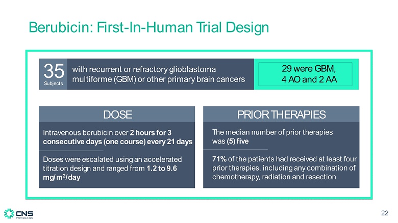 Berubicin: First - In - Human Trial Design 22 with recurrent or refractory glioblastoma multiforme (GBM) or other primary brain cancers 29 were GBM, 4 AO and 2 AA 35 Subjects DOSE Intravenous berubicin over 2 hours for 3 consecutive days (one course) every 21 days Doses were escalated using an accelerated titration design and ranged from 1.2 to 9.6 mg/m 2 /day PRIOR THERAPIES The median number of prior therapies was (5) five 71% of the patients had received at least four prior therapies, including any combination of chemotherapy, radiation and resection