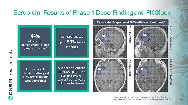 23 Berubicin: Results of Phase 1 Dose - Finding and PK Study 44% of subjects demonstrated “stable disease or better” Two responses with up to 80% tumor shrinkage Extremely well tolerated with a good safety profile (no off - target toxicities) DURABLE COMPLETE RESPONSE (CR) - One subject remains cancer - free ~17 years following treatment Complete Response at 6 - Month Post Treatment*