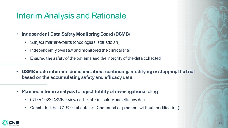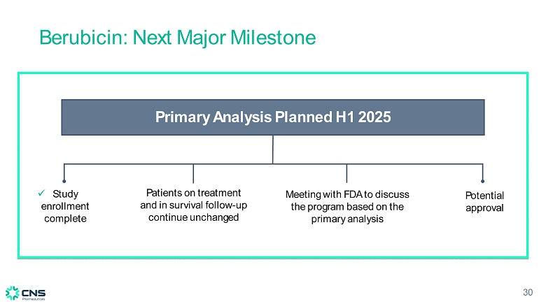 29 Interim Analysis and Rationale • Independent Data Safety Monitoring Board (DSMB) • Subject matter experts (oncologists, statistician) • Independently oversaw and monitored the clinical trial • Ensured the safety of the patients and the integrity of the data collected • DSMB made informed decisions about continuing, modifying or stopping the trial based on the accumulating safety and efficacy data • Planned interim analysis to reject futility of investigational drug • 07Dec2023 DSMB review of the interim safety and efficacy data • Concluded that CNS201 should be “Continued as planned (without modification)”