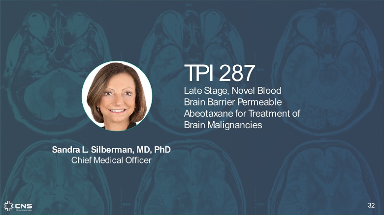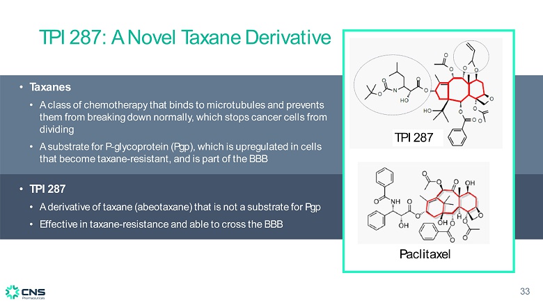 32 TPI 287 Late Stage, Novel Blood Brain Barrier Permeable Abeotaxane for Treatment of Brain Malignancies Sandra L. Silberman, MD, PhD Chief Medical Officer