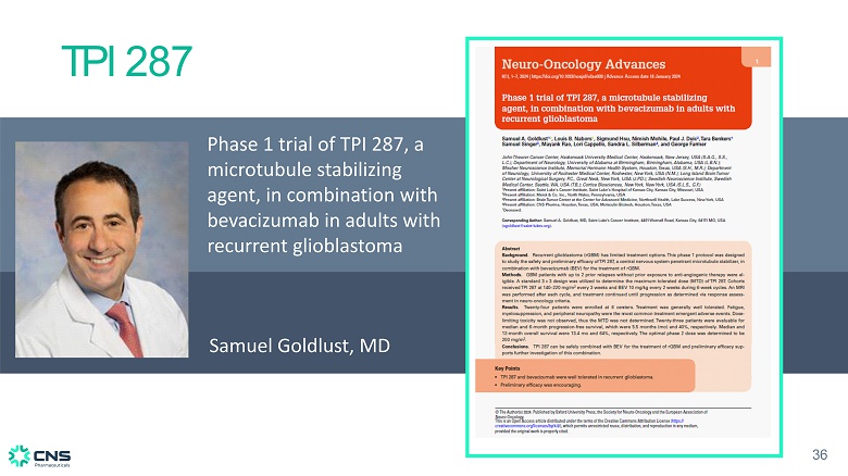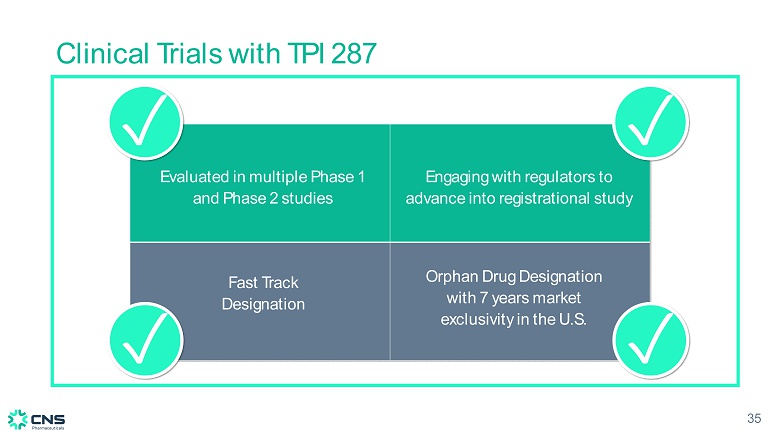 Clinical Trials with TPI 287 35 Evaluated in multiple Phase 1 and Phase 2 studies Engaging with regulators to advance into registrational study Fast Track Designation Orphan Drug Designation with 7 years market exclusivity in the U.S. ✓ ✓ ✓ ✓