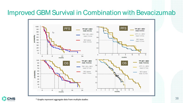TPI 287 in Combination with Bevacizumab for the Treatment of Recurrent Glioblastoma 37 Progression - Free Survival Overall Survival Median OS: 13.4 mo [95% C.I. 10.9, 17.9] 12 - month OS: 64% Median PFS: 5.5 mo [95% C.I. 4.1, 8.2] 6 - month PFS: 40%