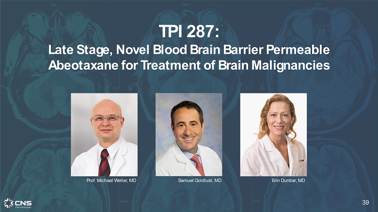 39 TPI 287: Late Stage, Novel Blood Brain Barrier Permeable Abeotaxane for Treatment of Brain Malignancies Prof. Michael Weller, MD Samuel Goldlust, MD Erin Dunbar, MD