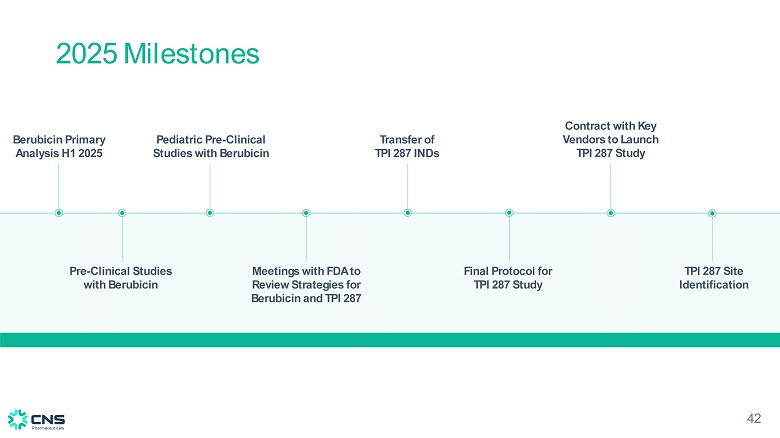 2025 Milestones 42 Berubicin Primary Analysis H1 2025 Pediatric Pre - Clinical Studies with Berubicin Pre - Clinical Studies with Berubicin Meetings with FDA to Review Strategies for Berubicin and TPI 287 Contract with Key Vendors to Launch TPI 287 Study Transfer of TPI 287 INDs TPI 287 Site Identification Final Protocol for TPI 287 Study
